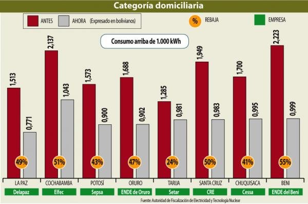 El Gobierno redujo las tarifas eléctricas que tendrá aplicación retroactiva a noviembre en ocho departamentos del país y permitirá que los consumidores ahorren Bs 24 millones al mes.En un acto oficial realizado en el Palacio de Gobierno, la presidenta constitucional transitoria de Bolivia, Jeanine Áñez, informó ayer que más de 2,8 millones de usuarios en La Paz, Cochabamba, Santa Cruz, Potosí, Oruro, Chuquisaca, Tarija y Beni se beneficiarán con “una significativa” disminución en los costos del servicio.“Esta reducción se dará sin afectar las utilidades de las empresas generadoras, transportadoras y distribuidoras de electricidad en el país y sin subvenciones del Tesoro General de la Nación (TGN), esto representa un cambio en el modelo económico de algunas regiones”, dijo la autoridad.La Jefa de Estado agregó que esta medida, aplicada en el marco de la Ley de Electricidad y el Reglamento de Precios y Tarifas, representa también un incentivo para las inversiones en la industria, servicios o comercio.La población debe tener la certeza de que la reducción de las tarifas eléctricas no afectará en absoluto a la economía nacional porque se trabajó de manera “muy objetiva y técnica” en la realización del estudio correspondiente, sostuvo el ministro de Energías, Rodrigo Guzmán.Consultado sobre cuánto economizarán los usuarios con la rebaja, la autoridad respondió: “La reducción que habrá, lo que se ahorrará, (entre) todos los consumidores en todo el país son alrededor de 24 millones de bolivianos al mes”.Beneficia a los consumidores del Sistema InterconectadoEl director de la Autoridad de Fiscalización de Electricidad, Luis Fernando Áñez, indicó que la rebaja de las tarifas eléctricas beneficia a todos los consumidores del Sistema Interconectado Nacional (SIN).Estos corresponden a La Paz, Oruro, Cochabamba, Chuquisaca, Santa Cruz, Potosí, Tarija y Beni, mientras que el departamento de Pando aún no está enlazado al sistema nacional.La medida beneficiará a todas las categorías que son: domiciliaria, comercial, general e industrial; sin embargo, se prioriza a la primera que registra “los rangos mayores de consumo”, detalló la utoridad.“Los consumidores van a empezar a pagar (con el plan de reducción de tarifas) a partir de su factura de diciembre (…); estamos haciendo que sea de carácter retroactivo para su aplicación a partir del 1 de noviembre”, indicó.Reducción de hasta 55%Según el Director de la Autoridad de Fiscalización de Electricidad, la región del Beni se beneficia con una reducción de tarifas de hasta 55%, Cochabamba, hasta 51%; Santa Cruz, 50%, y los demás departamentos por debajo de ese índice.En la categoría domiciliaria del Beni, para los usuarios que consumen arriba de 1.000 kilovatios hora (KWh) antes la tarifa era de Bs 2,223, pero ahora es de Bs 0,999 el KWh; es decir, que tienen una rebaja del 55%.Por otra parte, para los clientes de la categoría domiciliaria de Cochabamba que demandan más de 1.000 KWh, el costo de Bs 2,137 se redujo a Bs 1,043 el KWh, que significa una disminución de 51%.En el caso de La Paz, los usuarios de la categoría domiciliaria que consumen arriba de 1.000 KWh y antes pagaban Bs 1,513 ahora cancelarán Bs 0,771 el KWh, que significa una reducción del 49%.Destacan la medidaEl presidente de la Cámara Nacional de Industrias (CNI), Ibo Blazicevic, manifestó que esta medida beneficiará a todo este sector y es una “buena señal” para producir con mayores ventajas competitivas.“Aplaudimos la medida, nos parece tremendamente acertada. Definitivamente no creemos que va a afectar en gran escala porque los ajustes tampoco son en porcentajes mayores, pero sí es una muy buena señal y en Bolivia hoy necesitamos buenas señales”, indicó el principal representante ejecutivo de los industriales.Periódico Bolivia / Maribel Condori Monrroy