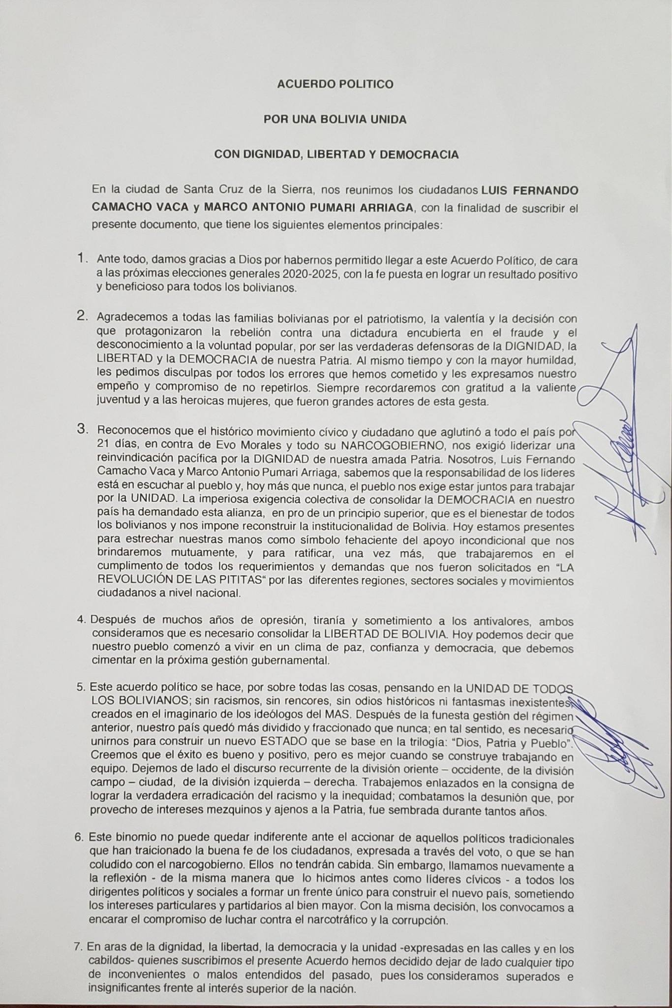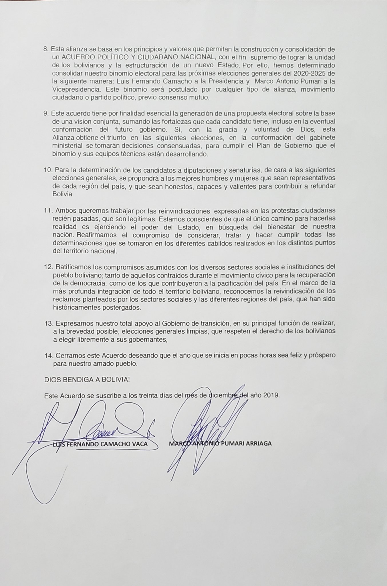 En la madrugada de este martes, Marco Pumari y Luis Fernando Camacho lograron un acuerdo para ir juntos a las elecciones generales de 2020. «Hemos logrado consolidar nuestro binomio presidencial», dice el punto ocho del acuerdo que establece que Camacho será el candidato a presidente y Pumari postulará a vicepresidente.El acuerdo político, que incluye 14 puntos y titula ‘Bolivia Unida con dignidad, libertad y democracia’, señala que la responsabilidad de los líderes es escuchar las demandas de la gente y que «el pueblo les exige estar juntos para trabajar juntos por la unidad«.El binomio expresa que se postularán a través de cualquier alianza o partido político y que para elegir candidatos a senadores y diputados, buscarán a personas representativas de cada región, que sean honestas y valientes para «refundar» Bolivia.