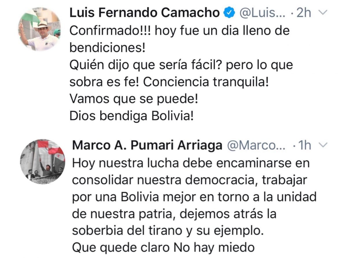 Camacho y Pumari publican mensajes en sus redes pero no aclaran si sellaron binomio presidencial