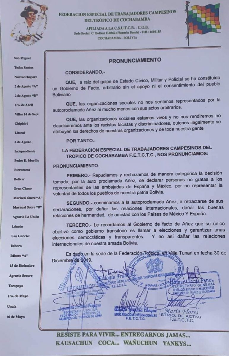 Campesinos del Trópico se solidarizan con Mexico y España, piden a Jeanine Añez retractarseCategorías DeRedes, Detrás de la Verdad, PolíticaEtiquetas 30/12/2019 Campesinos del Trópico se solidarizan con México y España, piden a Jeanine Añez retractarse Fuente: Detrás de la Verdad[fbo] eju.tv