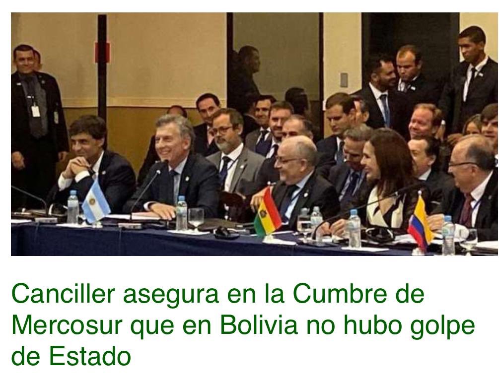 Creíble y bien recibido el informe de la Canciller en la reunión del Mercosur, no hubo golpe de estado afirmó, fue la sucesión constitucional que se impuso ante la huida de Evo y de su Vice, se evitó el vacío de poder y la Democracia ganó sentenció. https://t.co/KdSjTFrjZN