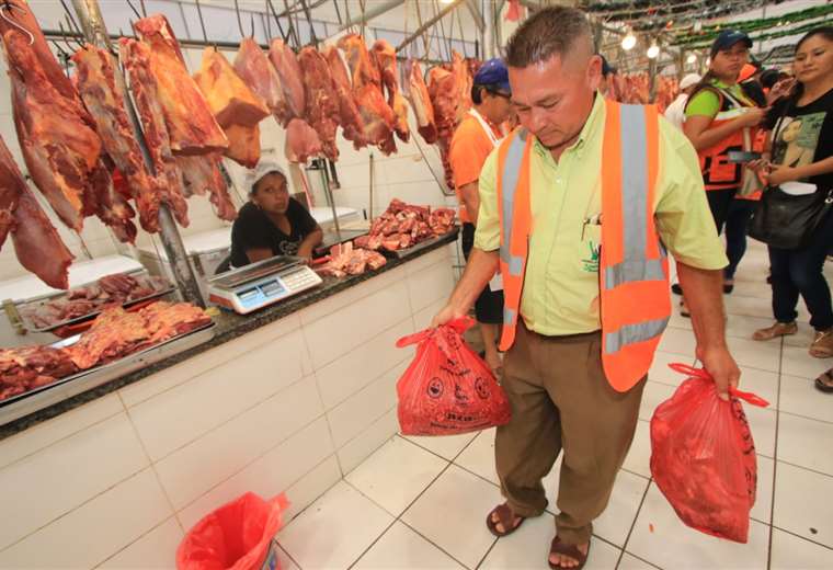 En un operativo sorpresa, funcionarios de la Alcaldía Municipal cruceña decomisaron carne en el mal estado en el nuevo mercado Los Pozos.