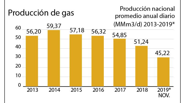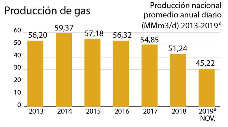 24% cae producción de gas. En 2014, la producción alcanzó un promedio de 59,37 MMm3d, mientras que en 2019 se redujo a 45,22 MMm3d. El descenso es acompañado de la caída de precios.