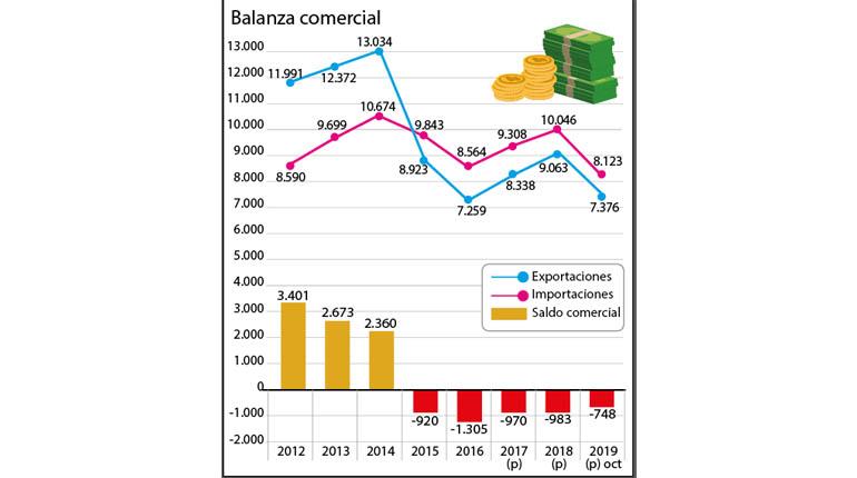 La balanza comercial también tiene problemas. Según datos del IBCE, a octubre de 2019, el saldo comercial era de -748 millones de dólares, una diferencia marcada con relación a los 2.339 millones registrados en 2014, la última gestión con superávit.