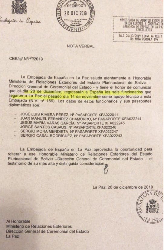 La nota verbal explica a la Dirección General de Ceremonial de Estado que “el 28 de diciembre regresarán a España el personal que ingresó el pasado 14 de noviembre como apoyo técnico a la legación diplomática en La Paz”.