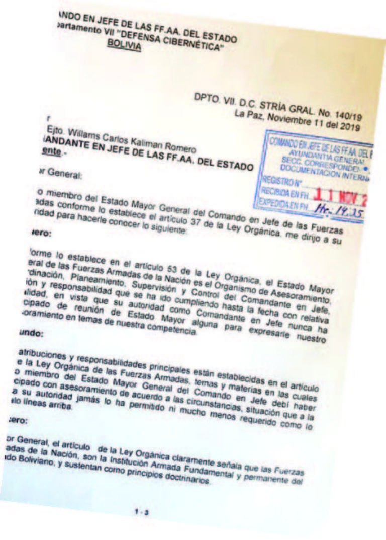 El general Rojas le había mandando una carta a Kaliman a las 14:32 de ese 11 de noviembre, en la que le pide que cumpla con lo que dicta la Constitución Política del Estado (CPE) y le reprocha el hecho de que jamás pidió consejos ni se reunió con su Estado Mayor.