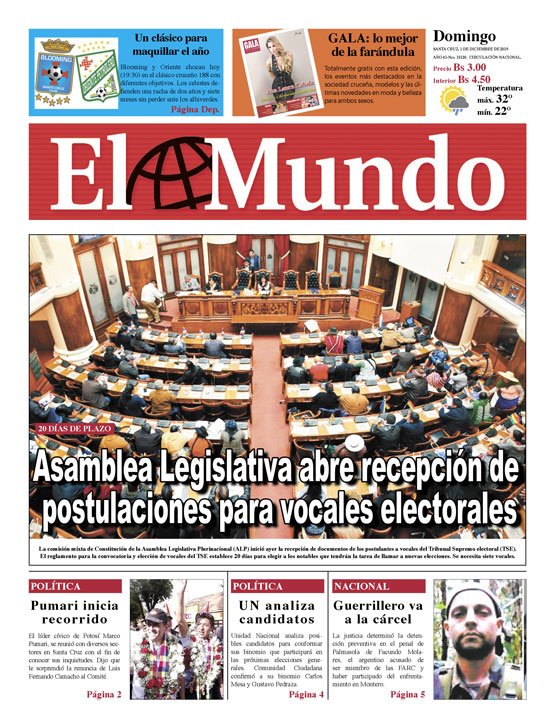 Portadas de periódicos de Bolivia del domingo 1 de diciembre de 2019