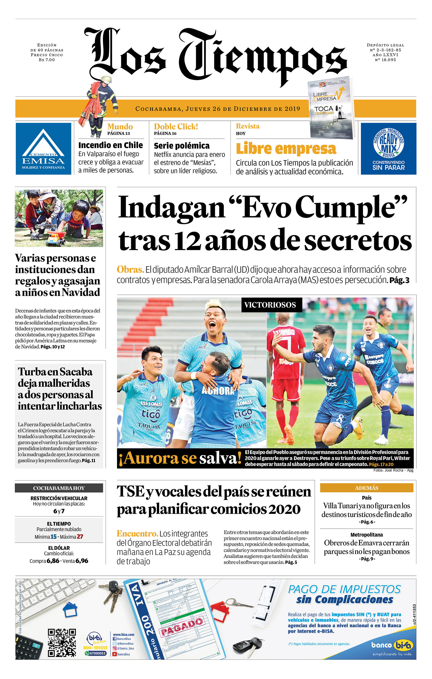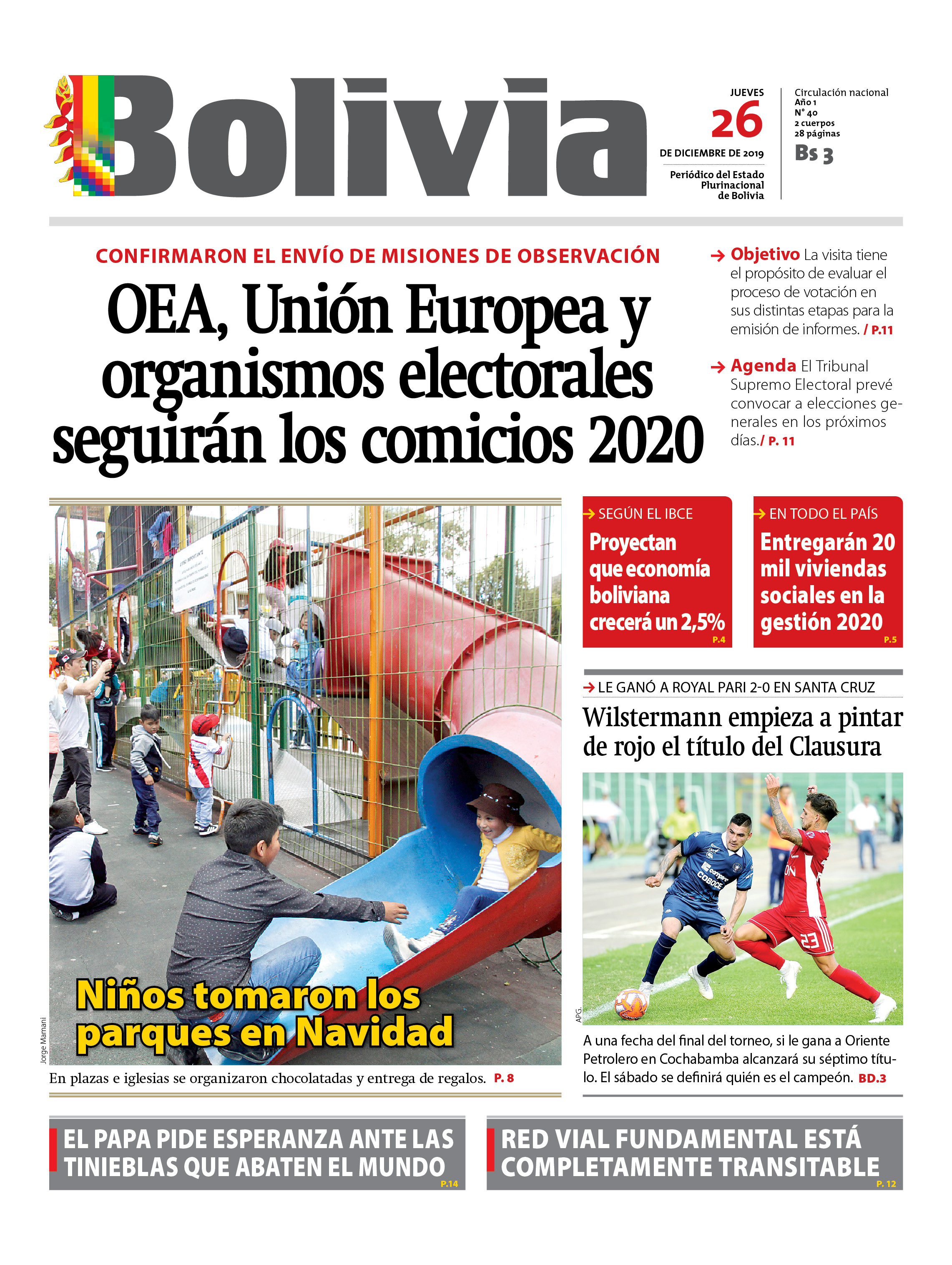 Portadas de periódicos de Bolivia del jueves 26 de diciembre de 2019