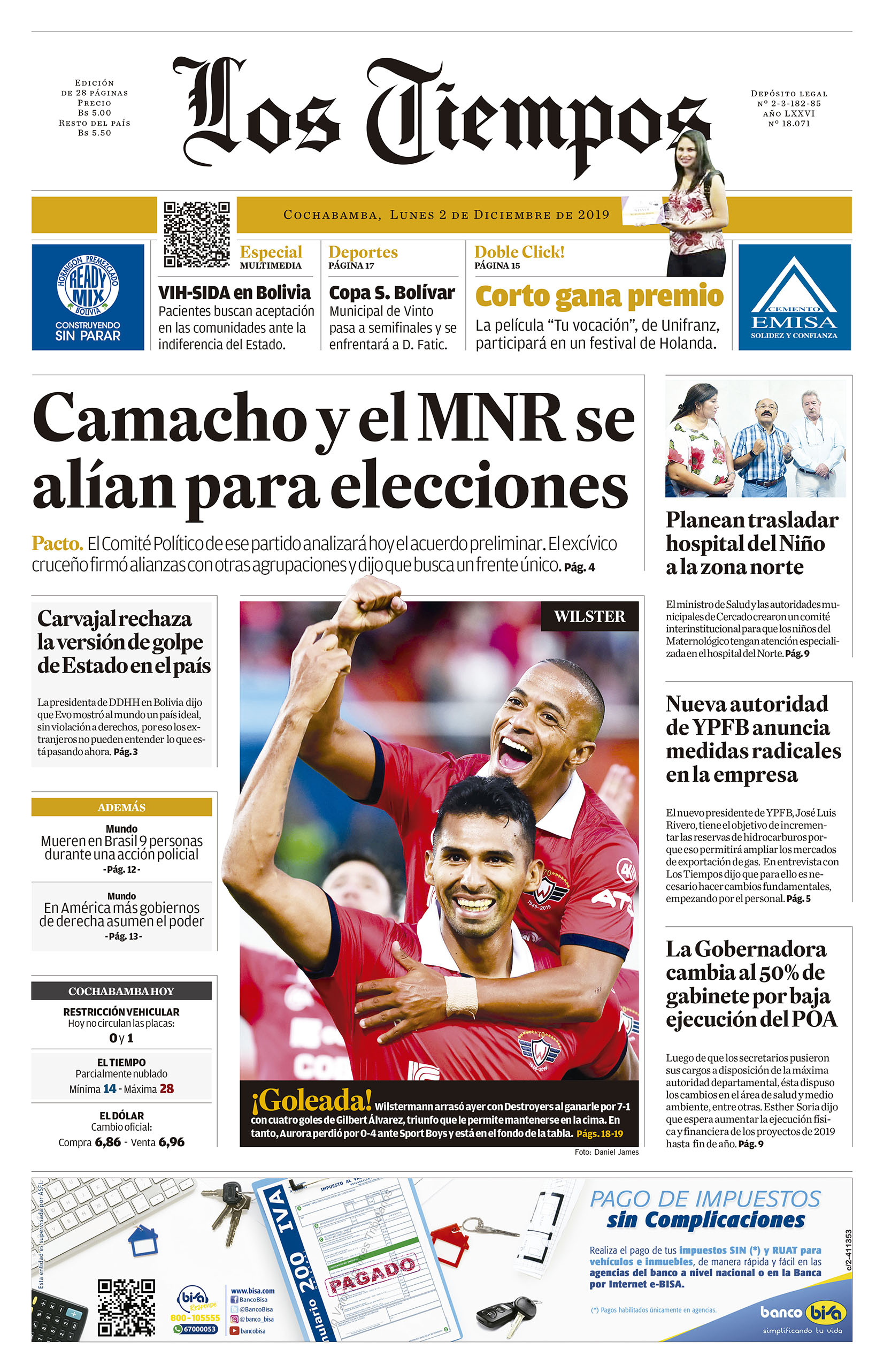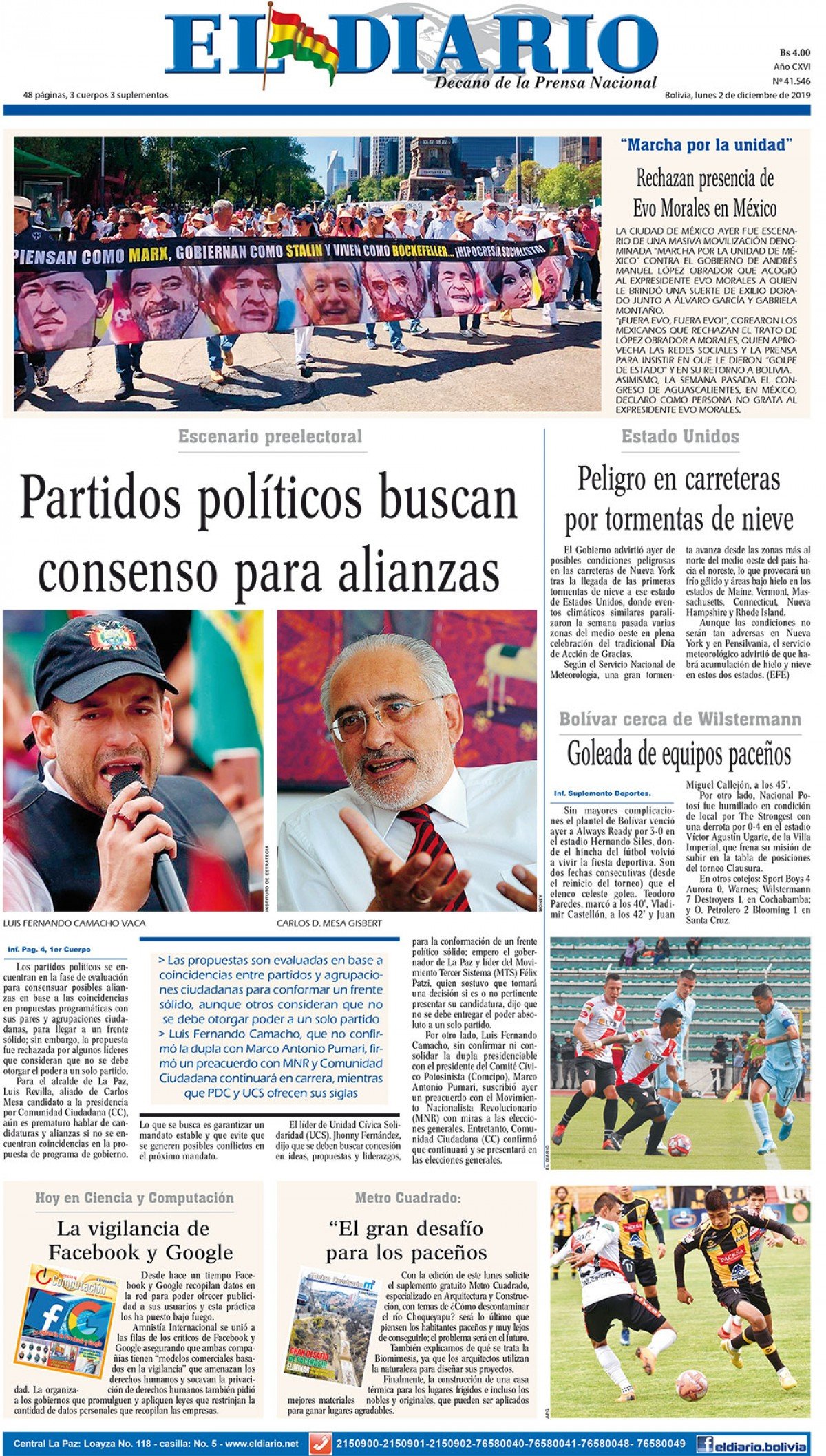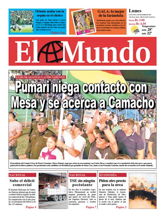 Portadas de periódicos de Bolivia del lunes 2 de diciembre de 2019Categorías MonitoreoEtiquetas , Portadas de periódicos 02/12/2019 El Deber – Los Tiempos – El Día – La Razón – Cambio – El Diario – Página Siete – Opinión
