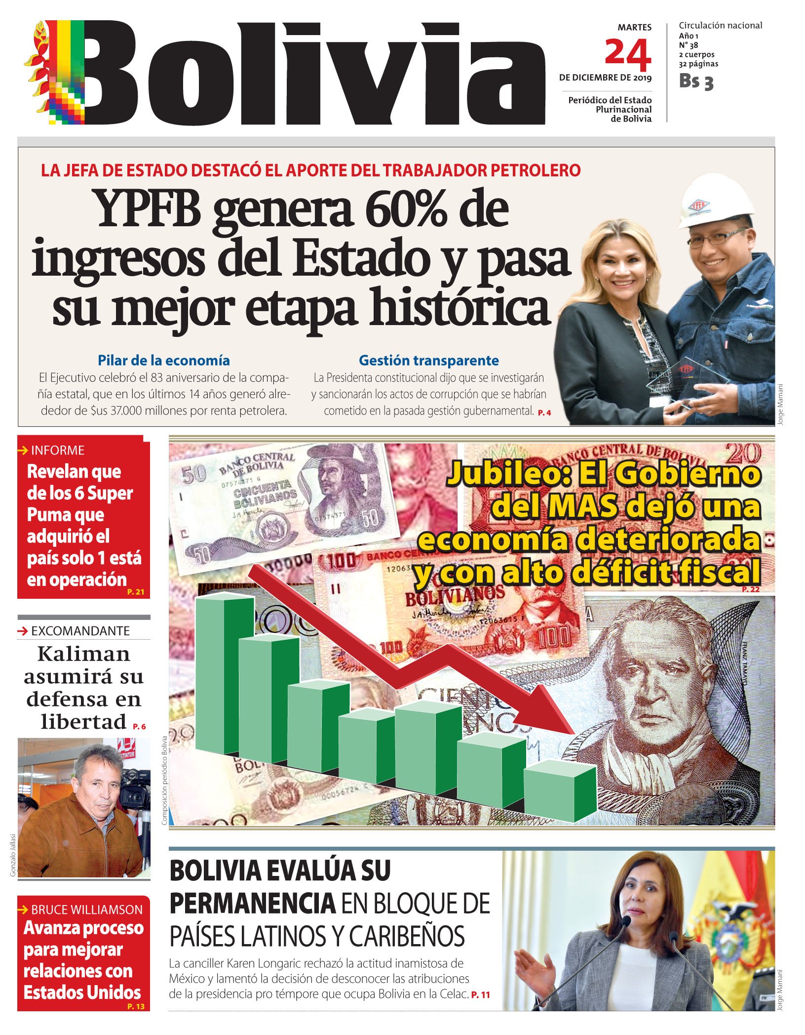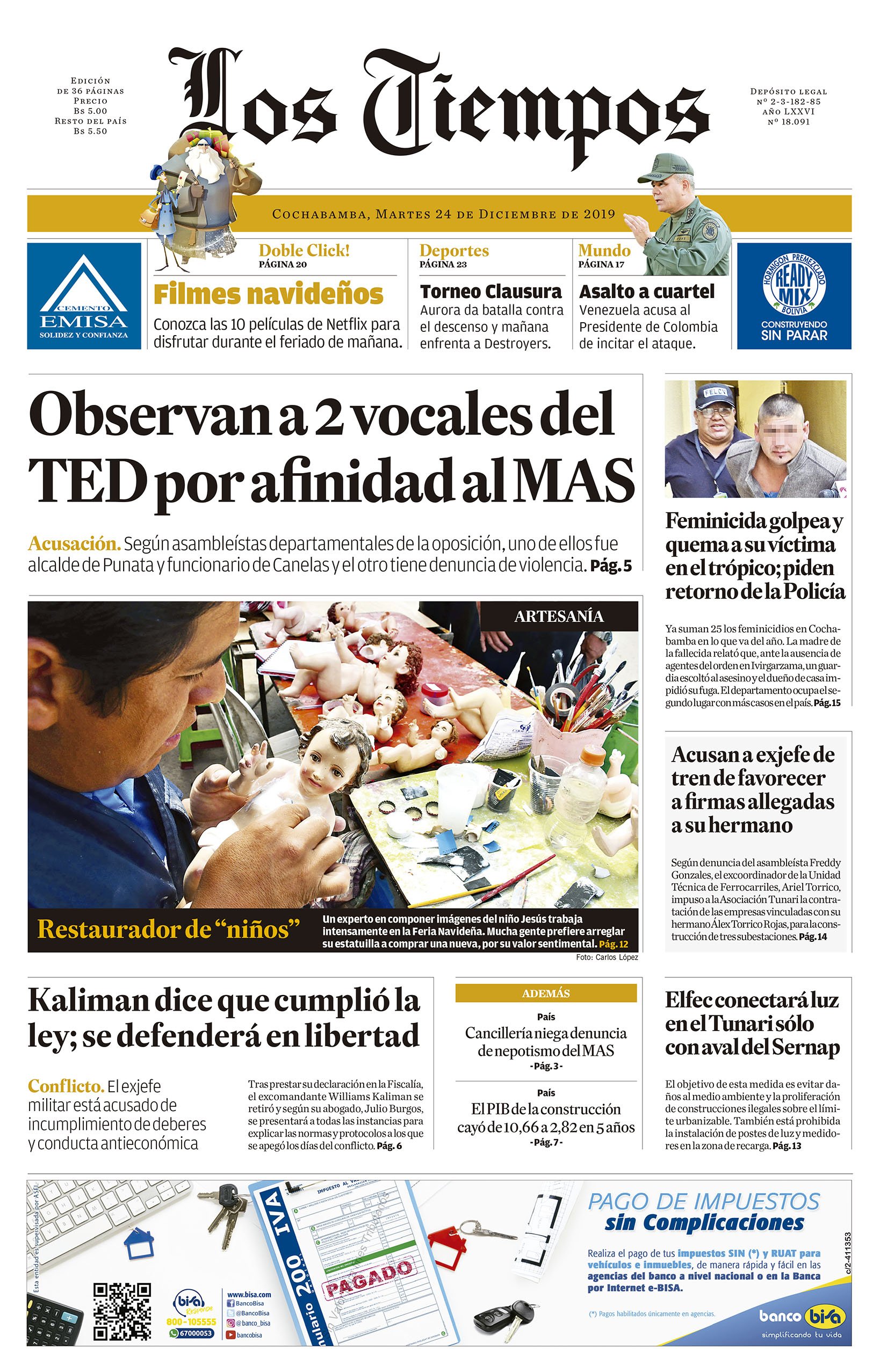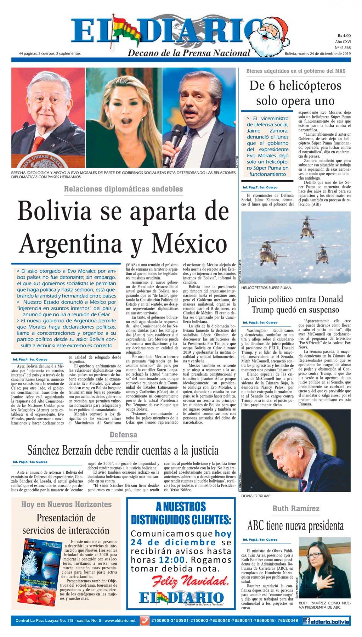 Portadas de periódicos de Bolivia del martes 24 de diciembre de 2019