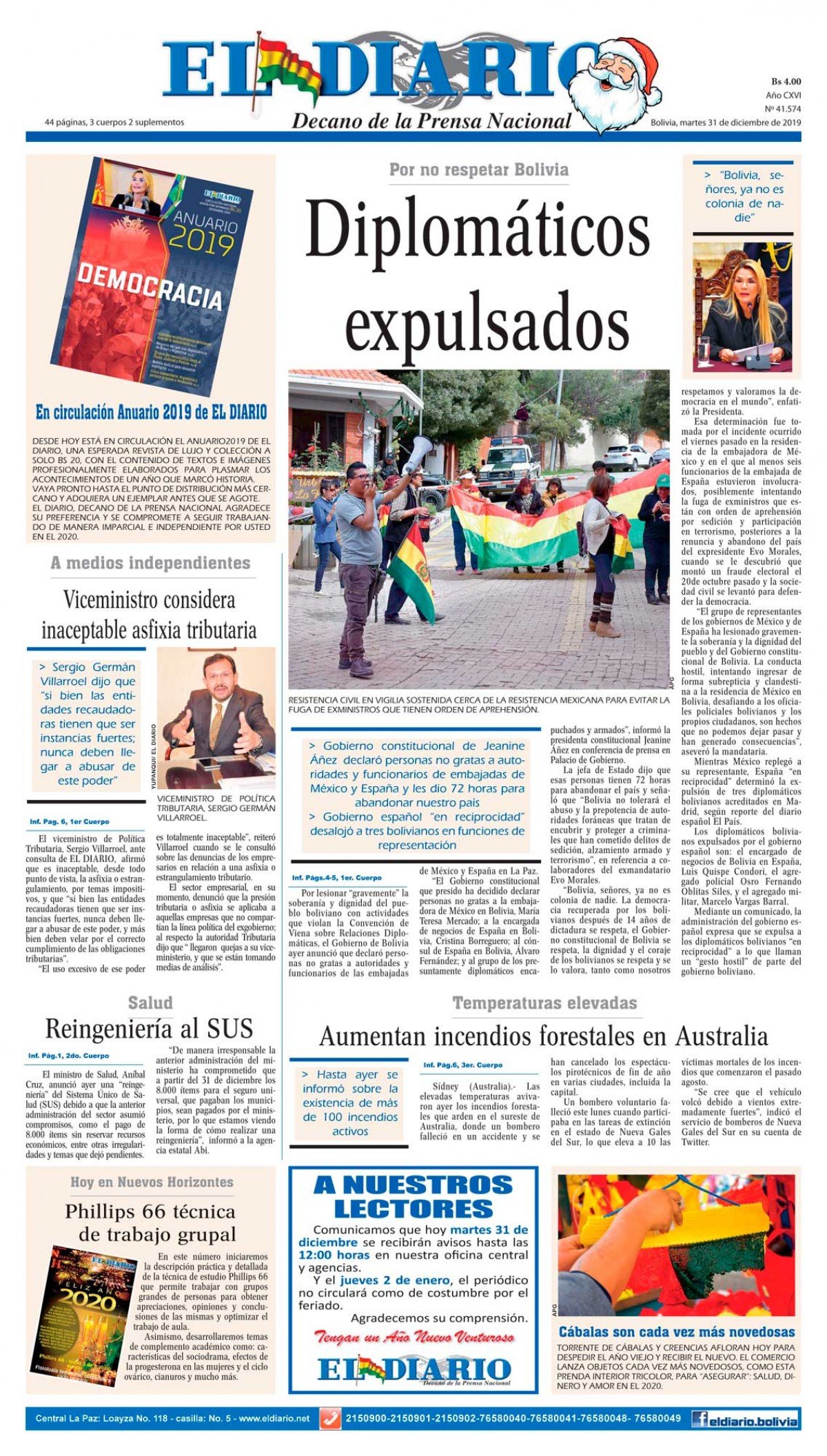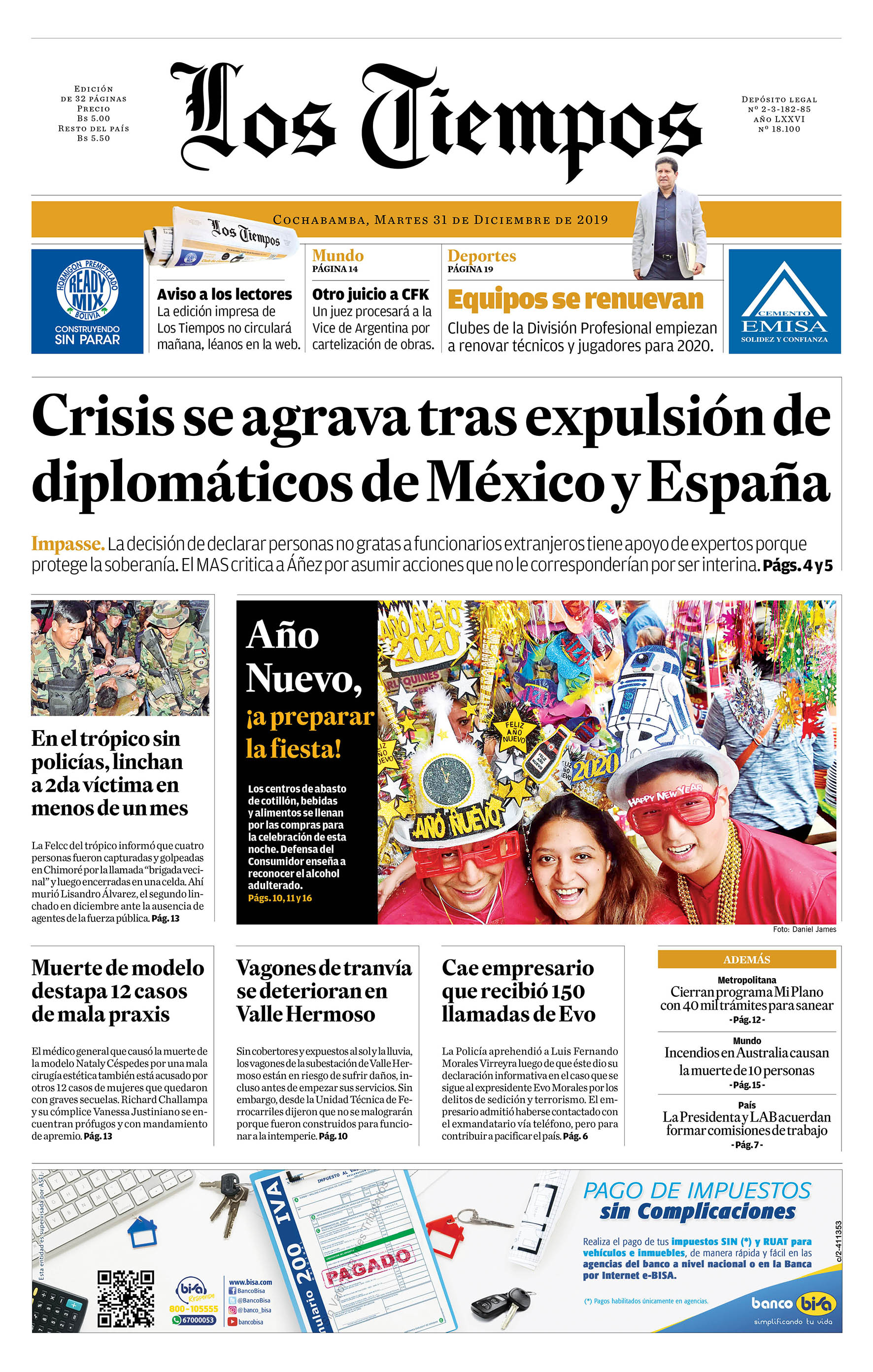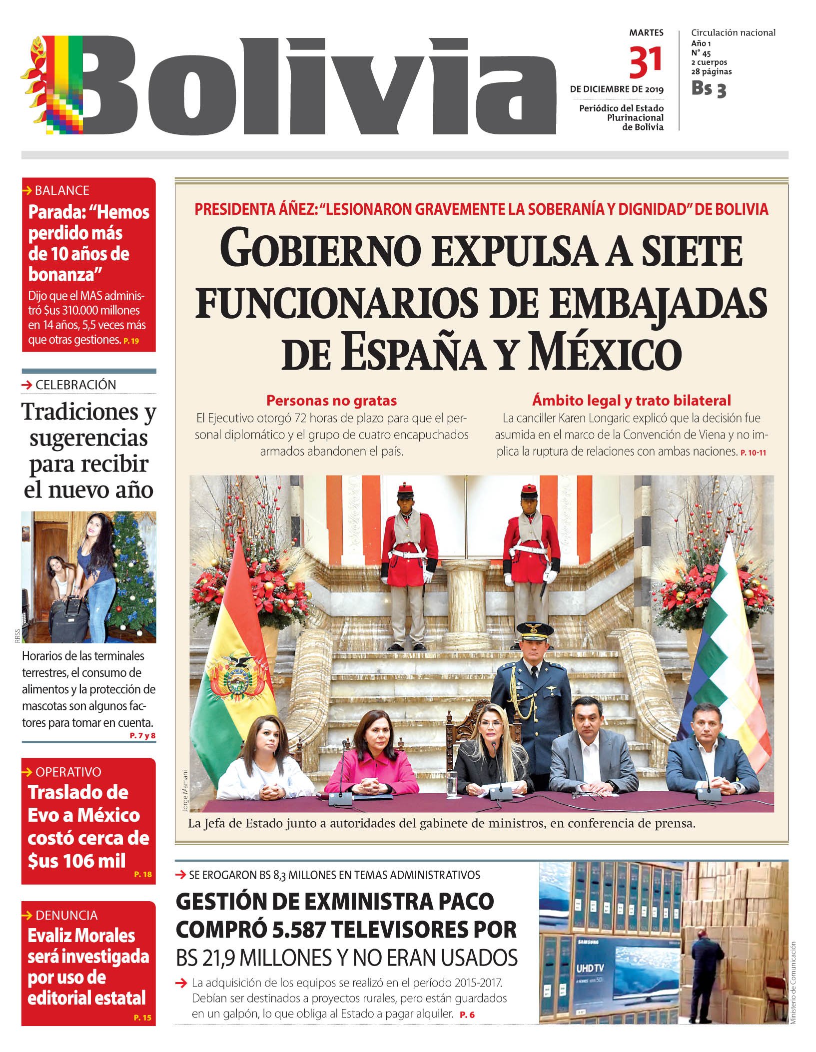 Portadas de periódicos de Bolivia del martes 31 de diciembre de 2019Categorías MonitoreoEtiquetas , Portadas de periódicos 31/12/2019 1 Portada 31 N.inddEl Deber – Los Tiempos – El Día – La Razón – Cambio – El Diario – Página Siete – Opinión