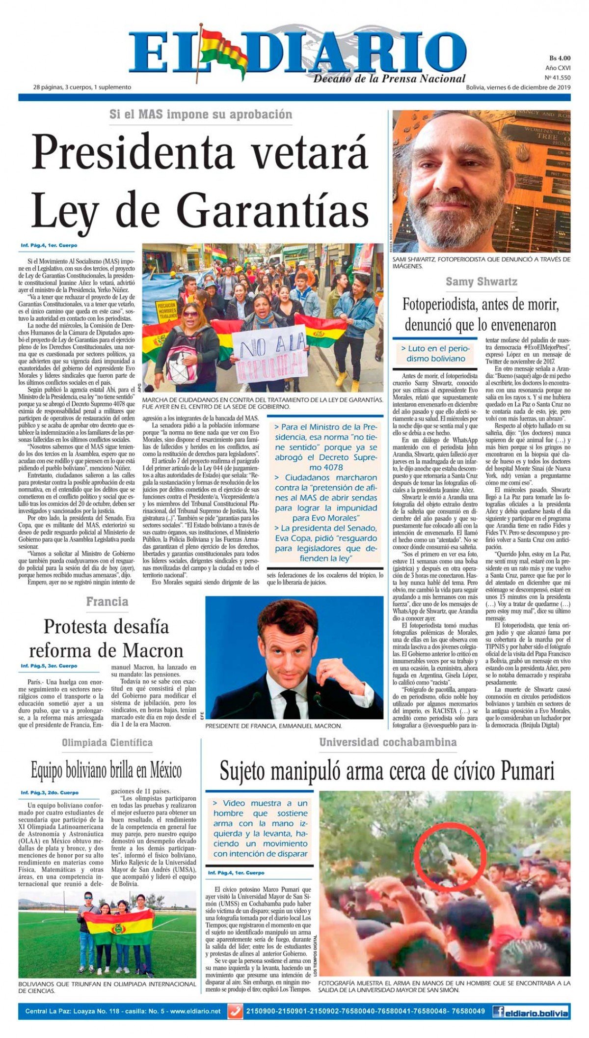 Portadas de periódicos de Bolivia del viernes 6 de diciembre de 2019Categorías MonitoreoEtiquetas , Portadas de periódicos 06/12/2019 1 Portada 6 N.inddEl Deber – Los Tiempos – El Día – La Razón – Cambio – El Diario – Página Siete – Opinión