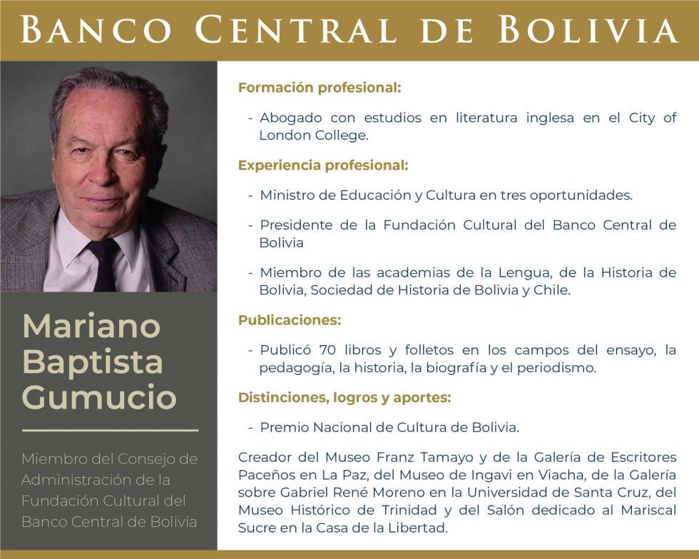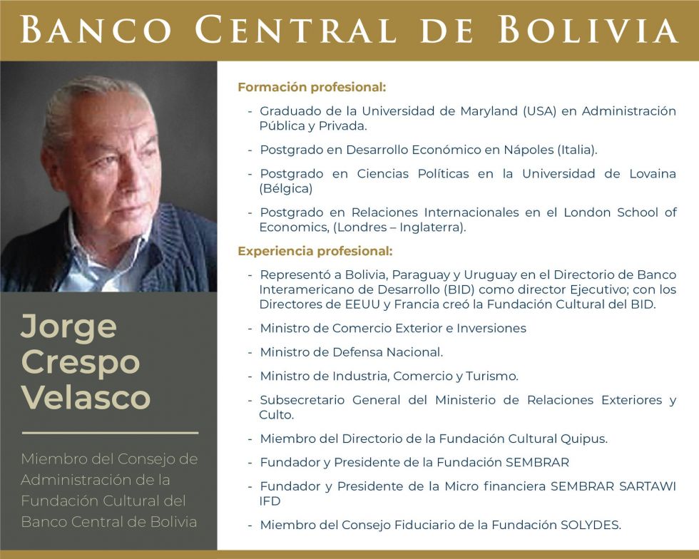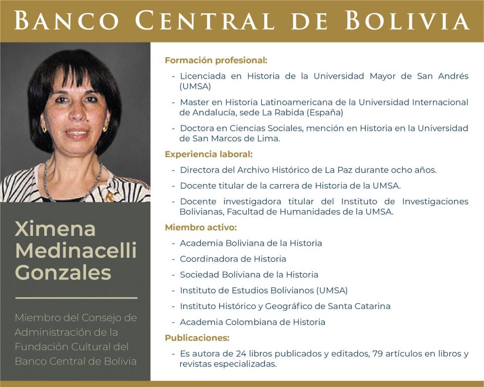 Baptista vuelve al directorio del que ya formó parte en el pasado, Medinacelli —que es nieta de María Gutiérrez— fue directora del Archivo Histórico de La Paz  mientras que Crespo es más reconocido por su condición de exministro y embajador de Bolivia en Estados Unidos.Se desconoce si el Ministerio de Culturas nombrará a los tres que le corresponden.El Potosí / Potosí