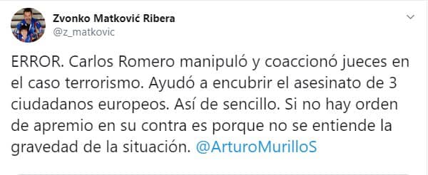 Santa Cruz./ Zvonko Matkovic Ribera, acusado en el caso Rozsa, escribió un mensaje en su red social de twitter recordándole al ministro de Gobierno, Arturo Murillo que el exministro, Carlos Romero manipuló y coaccionó a los jueces en el caso terrorismo.
