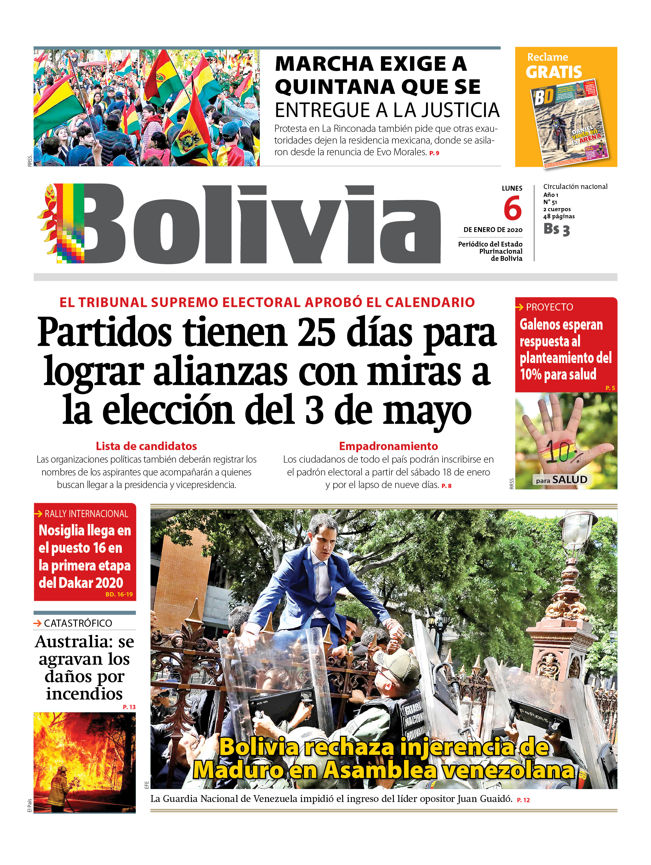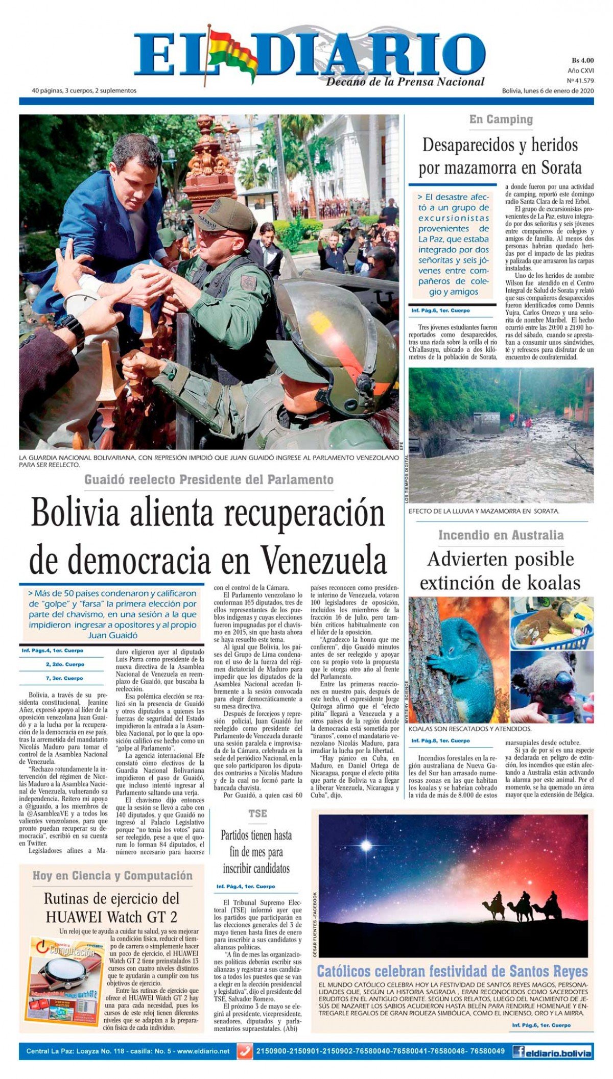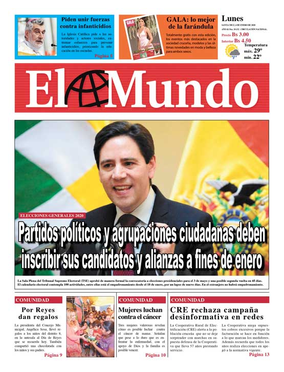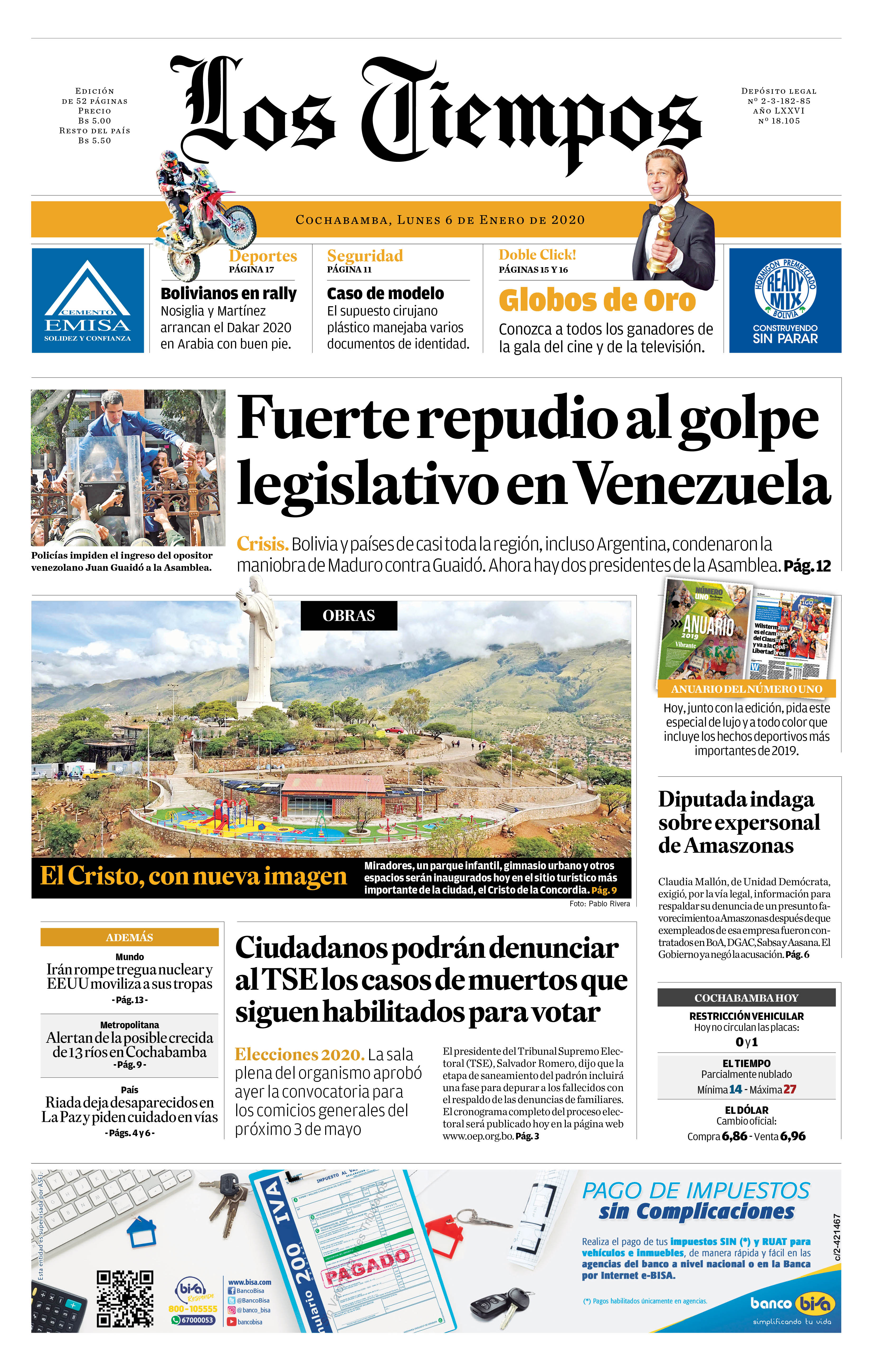 Portadas de periódicos de Bolivia del lunes 6 de enero de 2020Categorías MonitoreoEtiquetas , Portadas de periódicos 06/01/2020 El Deber – Los Tiempos – El Día – La Razón – Cambio – El Diario – Página Siete – Opinión