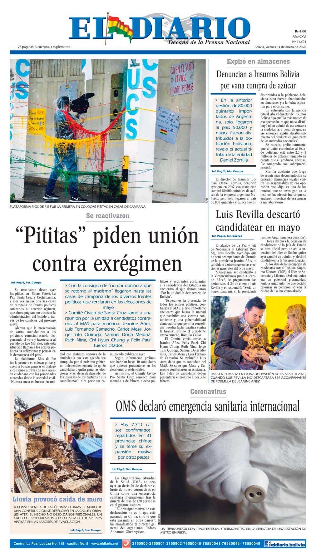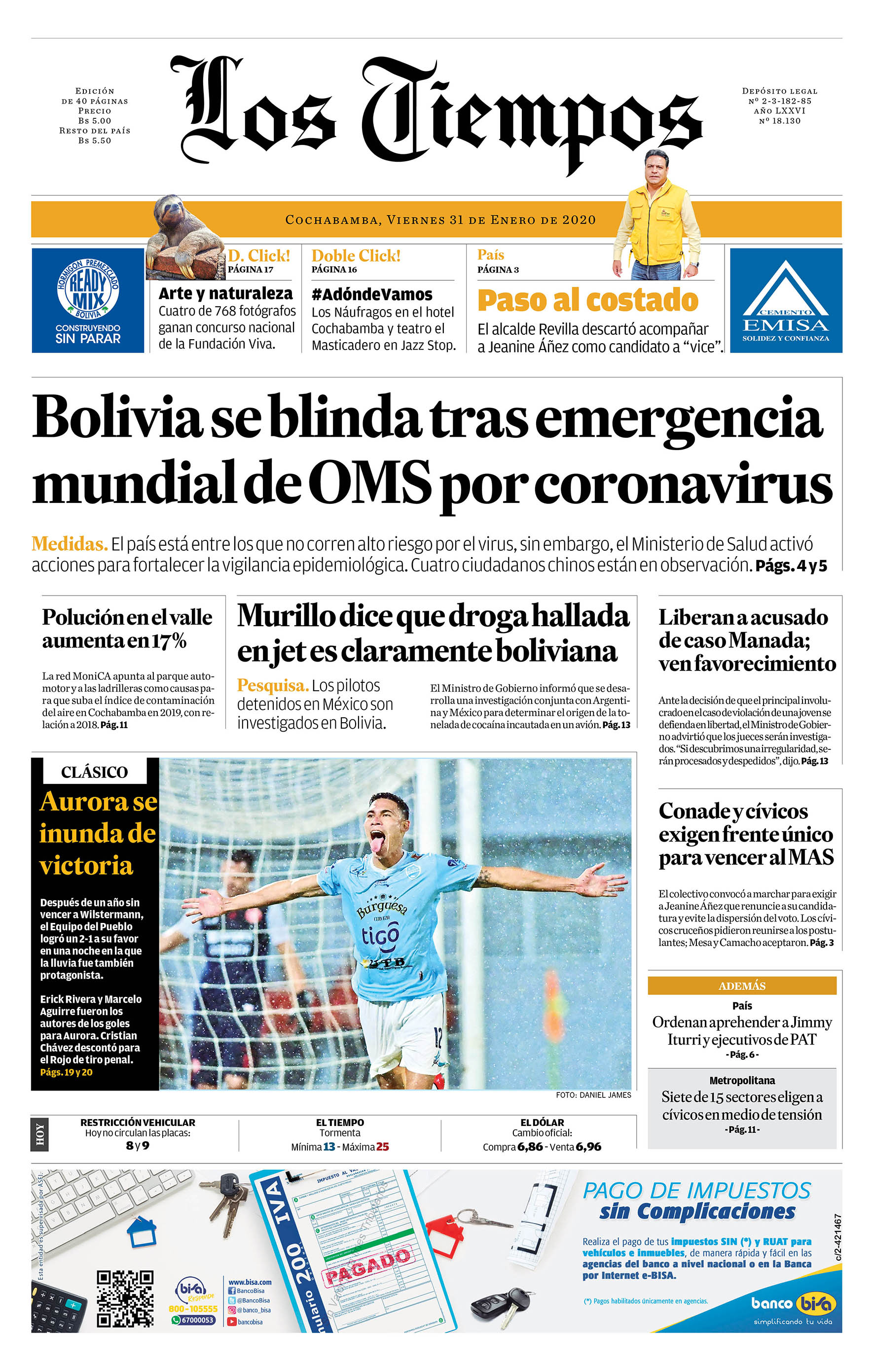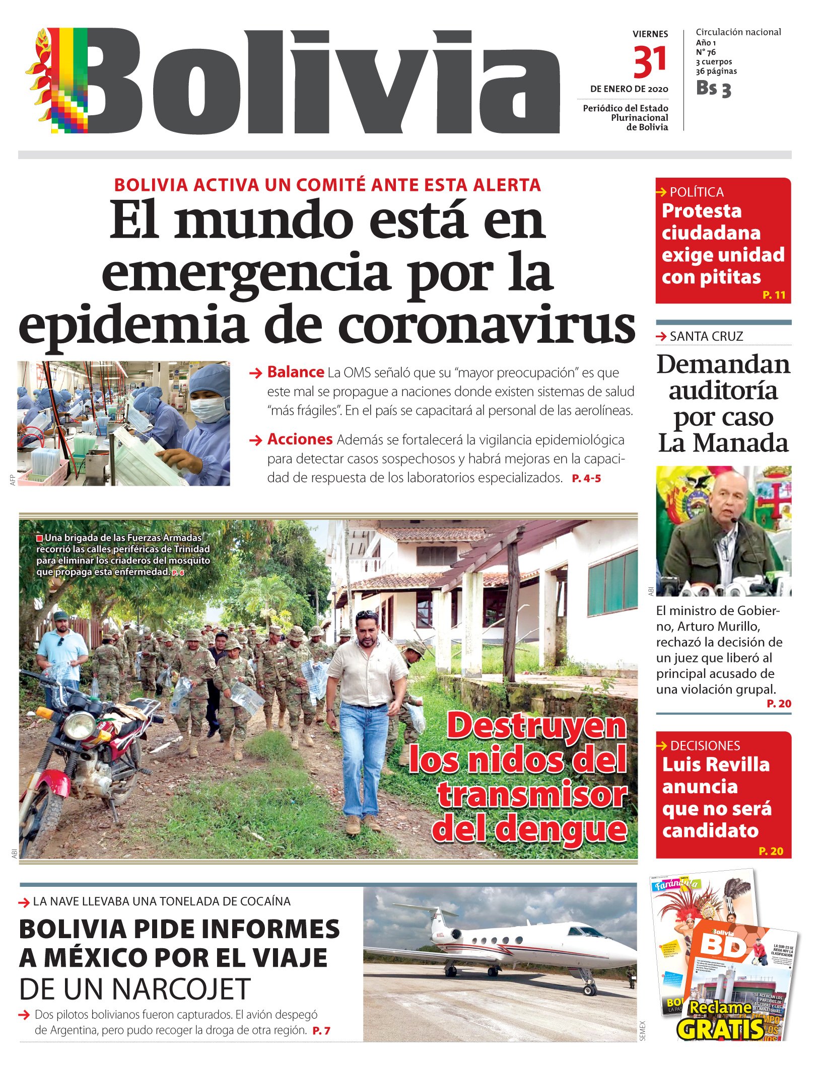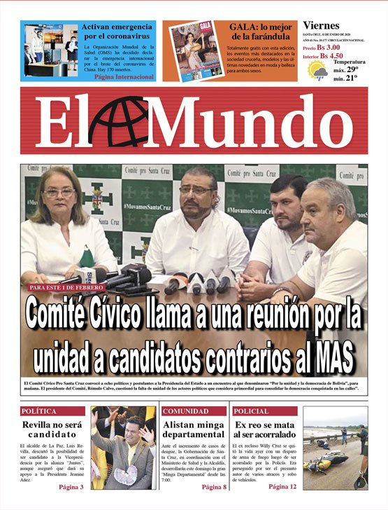 Portadas de periódicos de Bolivia del viernes 31 de enero de 2020Categorías MonitoreoEtiquetas , Portadas de periódicos 31/01/2020 1 Portada 31 N.inddEl Deber – Los Tiempos – El Día – La Razón – Cambio – El Diario – Página Siete – Opinión