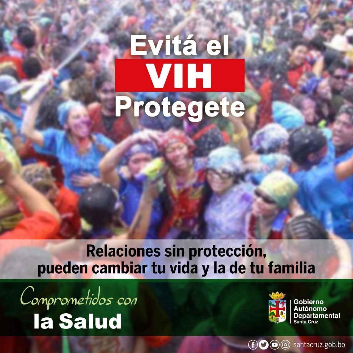 Comprometidos con la Salud te anunciamos que relaciones sin protección, puede cambiar tu vida y la de tu familia. En este Carnaval evitemos el exceso de bebidas alcohólicas y relaciones sexuales sin protección para prevenir enfermedades de trasmisión sexual y el VIH. Evitá el VIH, ¡protégete! Visítanos en ? www.santacruz.gob.bo