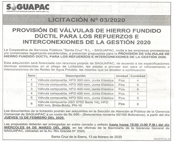 La Cooperativa de Servicios Públicos «Santa Cruz» R.L. – SAGUAPAC, invita a las empresas proveedoras y/o comerciales legalmente establecidas, a presentar propuestas para la PROVISIÓN DE VÁLVULAS DE HIERRO FUNDIDO DÚCTIL PARA LOS REFUERZOS E INTERCONEXIONES DE LA GESTIÓN 2020.
