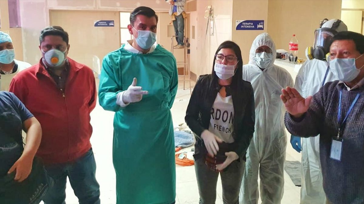 Una delegación de médicos de la Organización Mundial de la Salud (OMS), funcionarios del Banco Interamericano de Desarrollo (BID), el Ministro de Tabajo, la Gobernadora, el Alcalde y personal del Servicio Departamental de Salud (SEDES) de Cochabamba realizan una inspección a centros médicos de la ciudad.