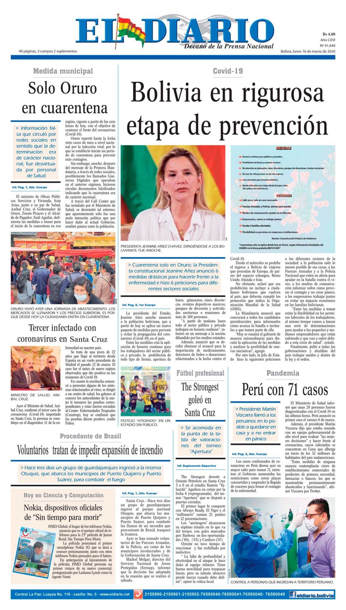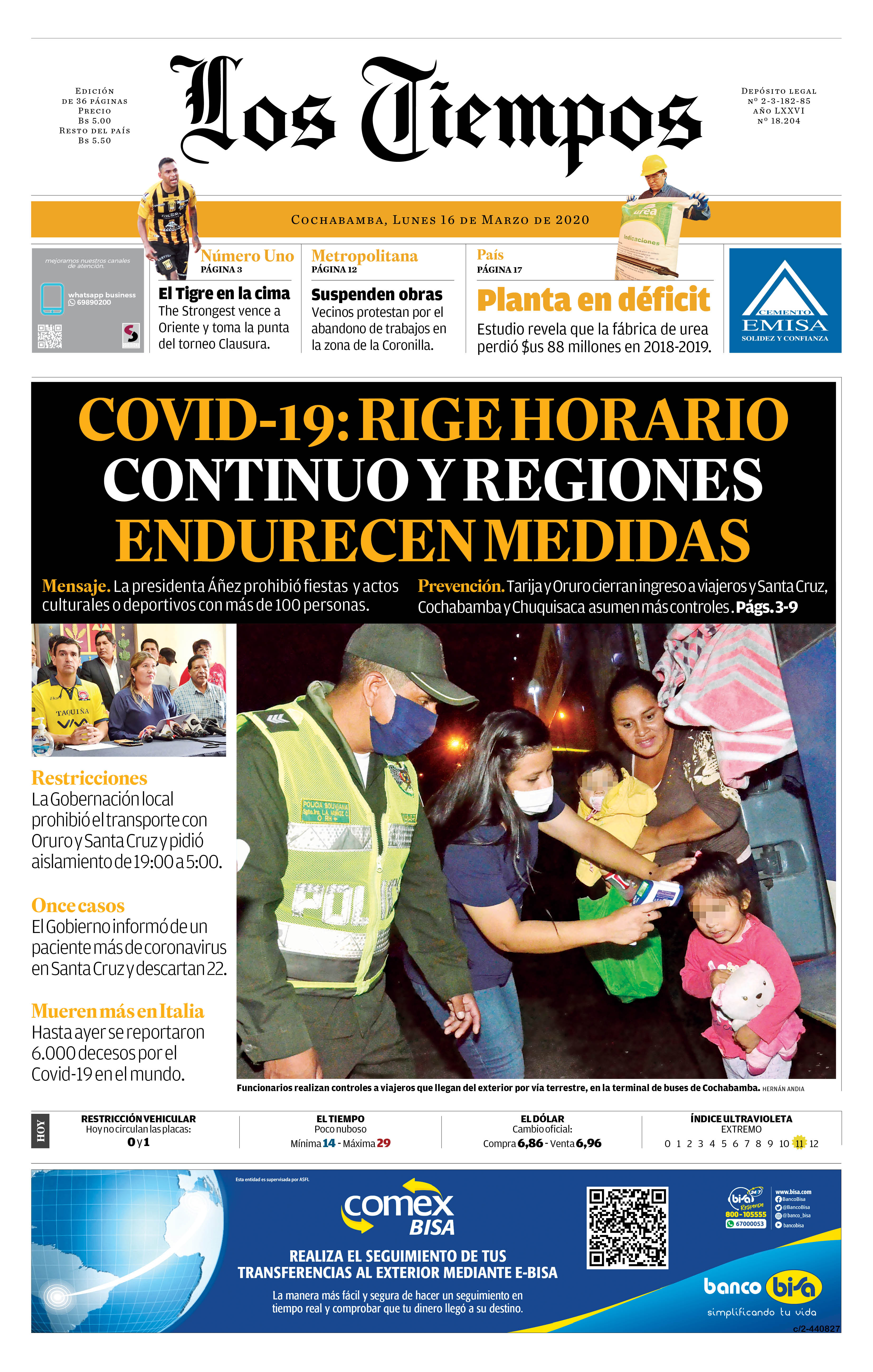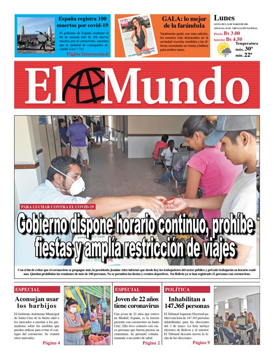 Portadas de periódicos de Bolivia del lunes 16 de marzo de 2020Categorías MonitoreoEtiquetas , Portadas de periódicos 16/03/2020 El Deber – Los Tiempos – El Día – La Razón – Cambio – El Diario – Página Siete – Opinión – La Estrella dle Oriente- Correo del Sur – El Periodico – Nuevo Sur – La Patria – El País