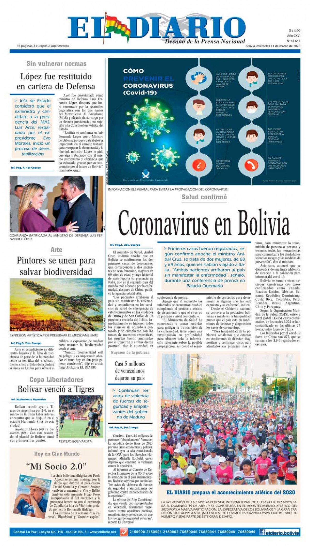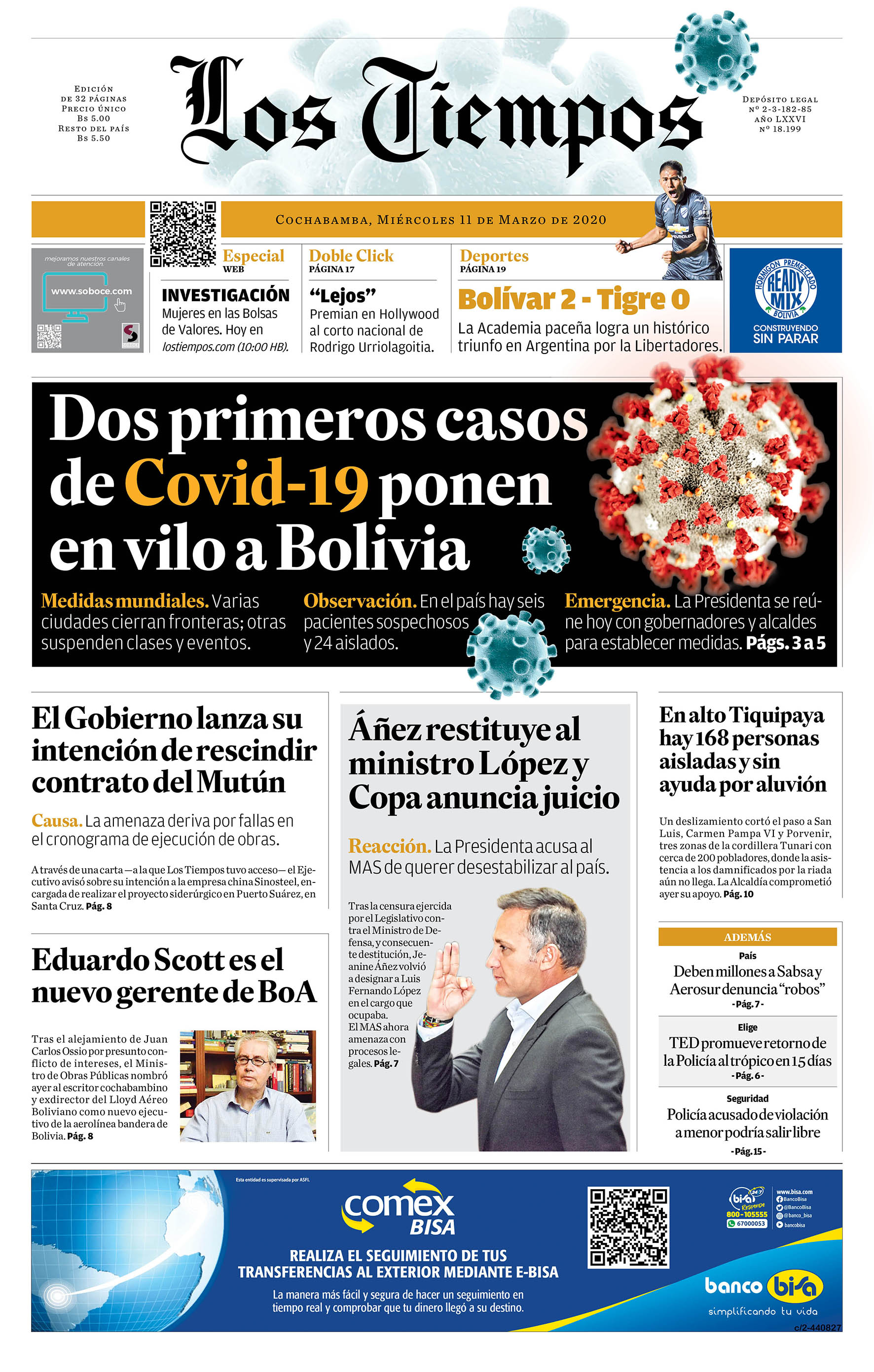 Portadas de periódicos de Bolivia del miércoles 11 de marzo de 2020