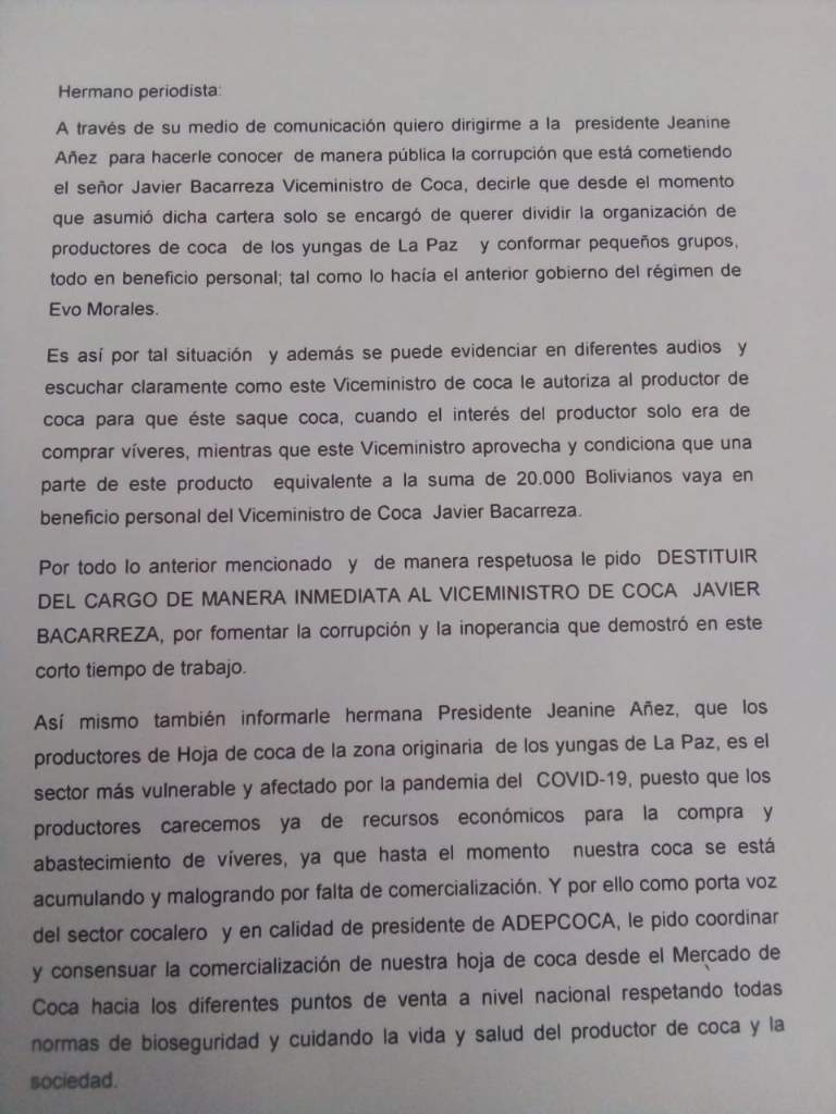 De manera respetuosa le pido destituir del cargo de manera inmediata al viceministro de la Coca, Javier Bacarreza, por fomentar la corrupción y por la inoperancia que demostró en todo este tiempo, señala Gutiérrez en la nota dirigida a la Presidenta.