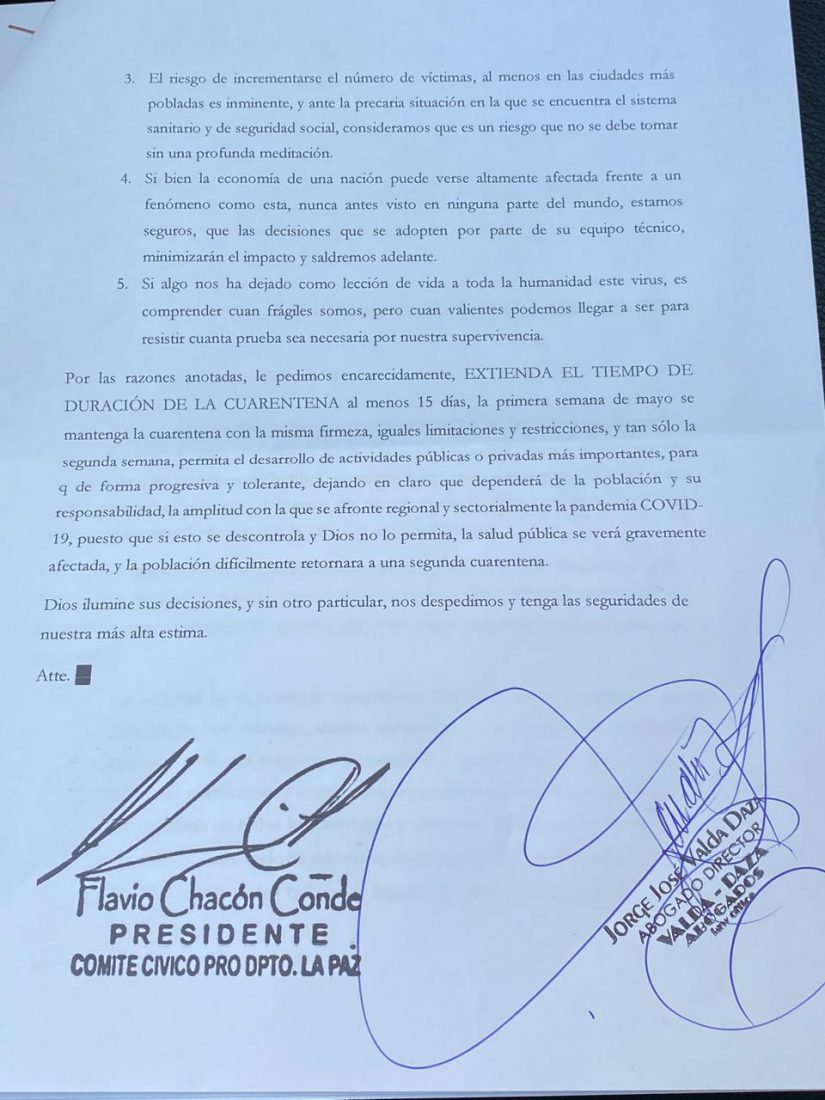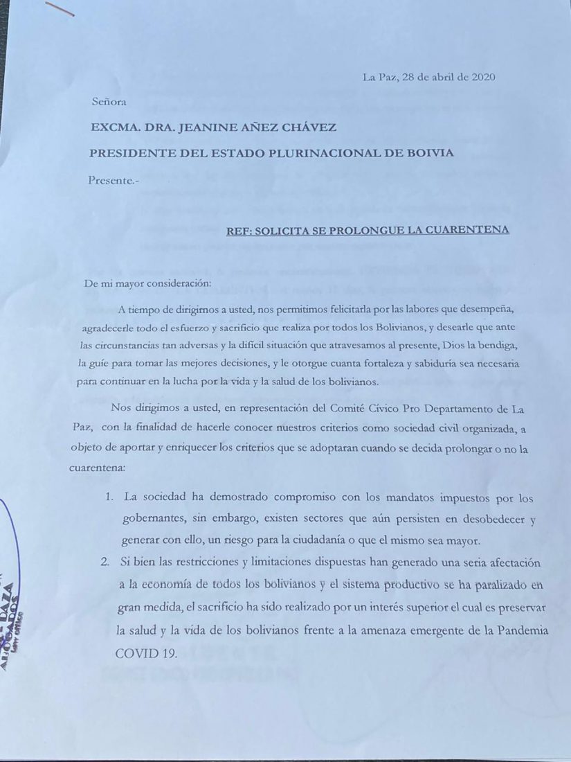 Comité Cívico de La Paz, envió una misiva a la presidenta Jeanine Añez solicitando la ampliación de la cuarentena al menos 15 días más, hasta mediados de mayo y revisando la medida la primera semana de mayo para ir flexibilizando de a poco a sectores importantes para la producción.