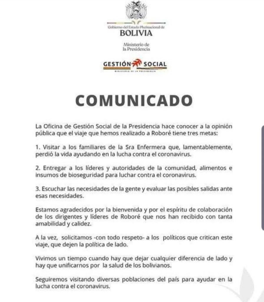 No obstante, el canal estatal Bolivia TV mostró imágenes de la responsable de Gestión Social entregando alimentos e insumos de bioseguridad en Roboré. Informó que la entrega se hizo a la presidenta del Consejo Municipal, Maritza Flores, y a representantes de las Organizaciones Territoriales de Base.