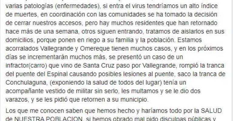 «Estamos acorralados. Vallegrande y Omereque tienen muchos casos (de Covid-19), y en los próximos días se incrementarán muchos más. Se presentó un caso de un infractor (chofer) que vino de Santa Cruz, pasó por Vallegrande, rompió la tranca del puente del Espinal causando posibles «lesiones» al puente. Sacó la tranca de Conchulaguna (exponiendo la salud de todos del lugar). Tenía un acompañante vestido de militar sin serlo, les multamos y se le dio dos varazos, y se les pidió que retornen a su municipio», agrega el comunicado de ese municipio.