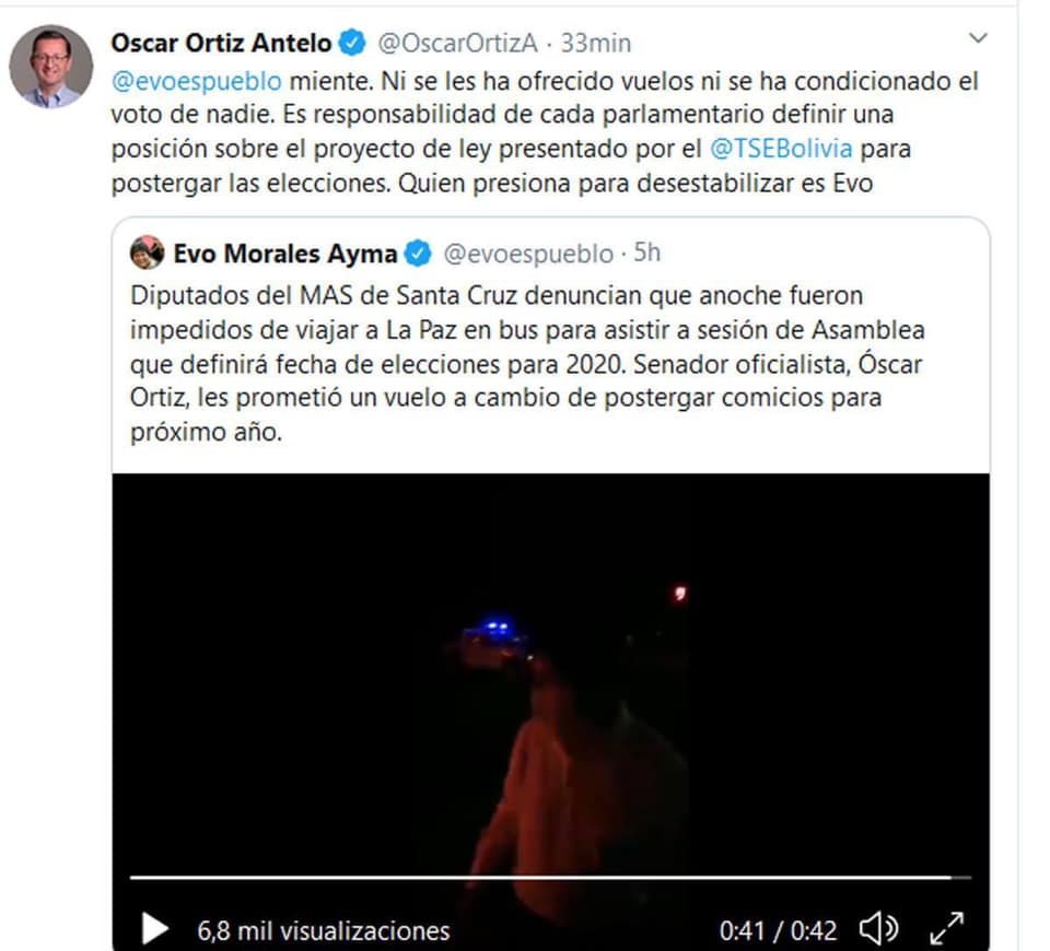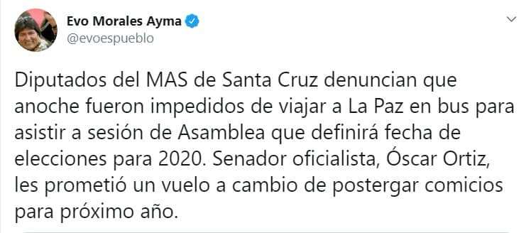 “Diputados del MAS de Santa Cruz denuncian que anoche fueron impedidos de viajar a La Paz en bus para asistir a sesión de Asamblea que definirá fecha de elecciones para 2020. Senador oficialista, Óscar Ortiz, les prometió un vuelo a cambio de postergar comicios para próximo año” (sic), acusó el exmandatario.