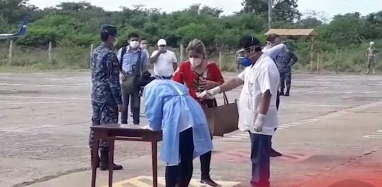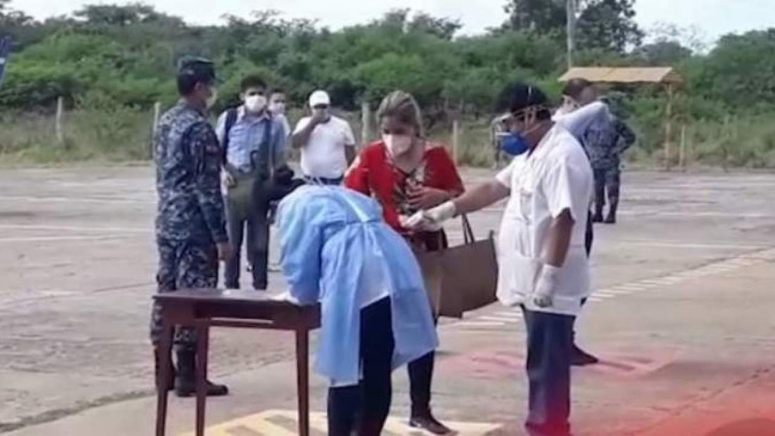 En el material audiovisual que registra la llegada de la hija de Añez a Roboré, en un avión de la FAB, se observa que efectivos de la Policía Militar (PM) esperan el arribo y posteriormente cargan unas bolsas y equipaje a una camioneta, presuntamente de propiedad del exalcalde de Roboré con destino al hotel Biotelmal.