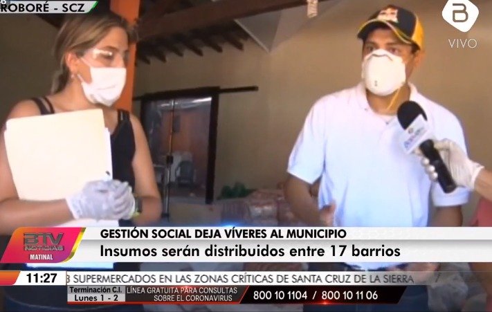 Tras la polémica generada por su viaje de Carolina Ribera, hija de la presidenta Jeanine Áñez y representante de la Unidad de Apoyo de Gestión de la Presidencia, hoy apareció ante las cámaras del canal estatal, cerca de las 11:00, e hizo la entrega de alimentos para 17 barrios, además de una cámara desinfectante en el hospital de ese municipio.