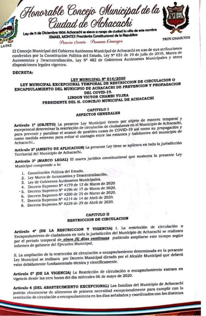 «Antes de tener uno o dos casos confirmados dentro de Achacachi queremos tomar medidas preventivas, es parte de nuestra responsabilidad», agregó Condori al remarcar que el control para su cumplimiento también contará con el apoyo de las Fuerzas Armadas y efectivos de la Policía Boliviana.