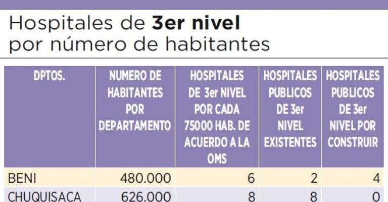 La OMS sugiere construir un hospital de tercer nivel por cada 75.000 habitantes, pero esas recomendaciones están alejadas de nuestra realidad. Solo el departamento de Chuquisaca estaría cumpliendo los parámetros de la Organización Mundial de la Salud (OMS), con ocho  hospitales de tercer nivel según los datos publicados en la Página Web del Sistema Nacional de Información en salud-Vigilancia Epidemiológica (SNIS-VE) dependiente del Ministerio de Salud.