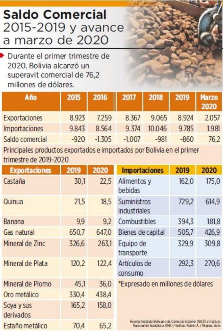 En el primer trimestre del 2020, Bolivia registró un superávit comercial de 76,2 millones de dólares. Y ello se debe principalmente por un incremento en el valor exportado del oro y una reducción de las importaciones en los primeros meses del año a causa de la pandemia del Coronavirus en el mundo, de acuerdo con la opinión del gerente del Instituto Boliviano del Comercio Exterior (IBCE), Gary Rodríguez.