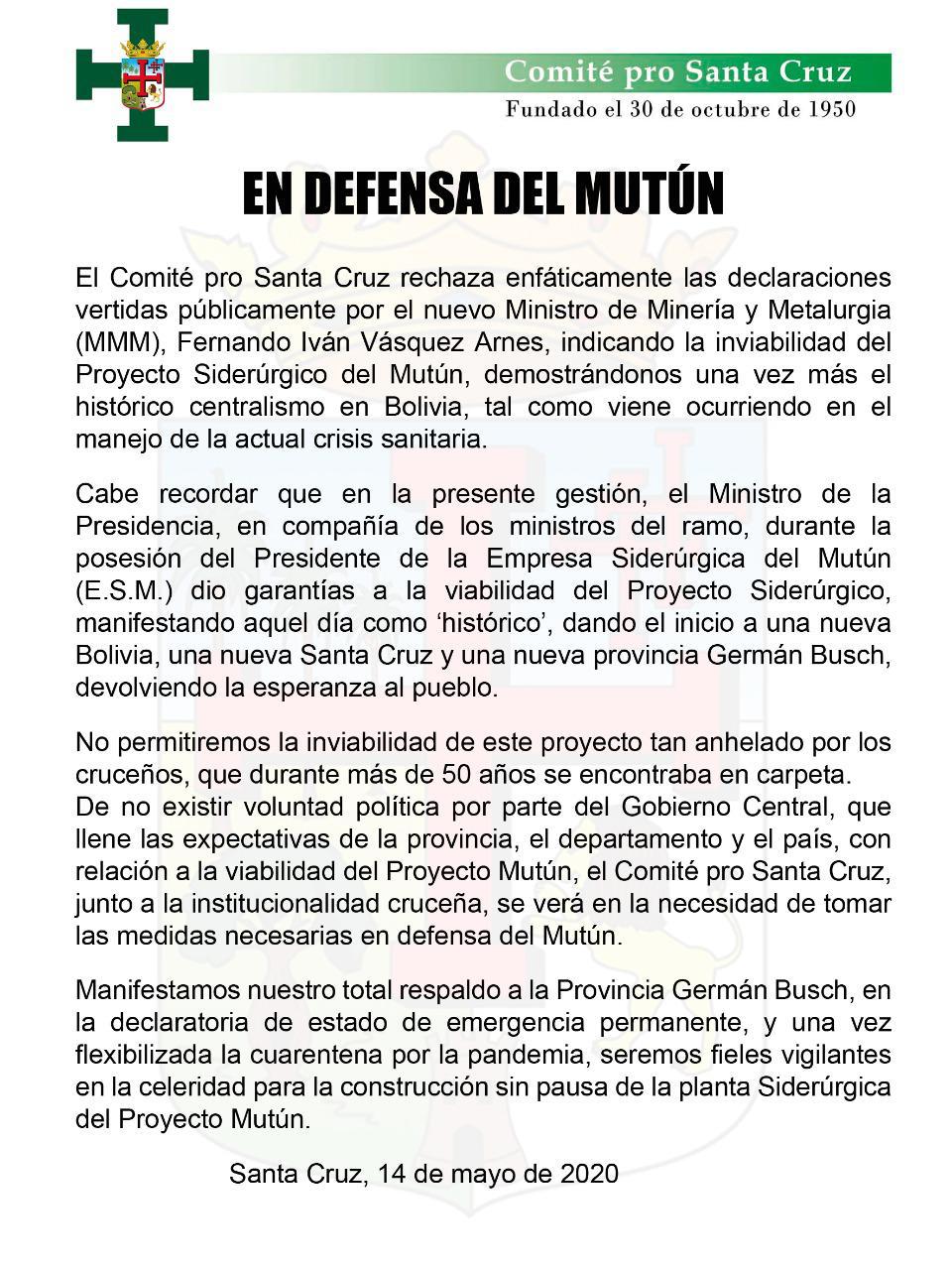 Los Comités Cívicos Provinciales emitieron un comunicado en el que rechazan las declaraciones del nuevo ministro de Minería y Metalurgia, Fernando Iván Vásquez Arnes, por señalar que el Proyecto Siderúrgico del Mutún es inviable.