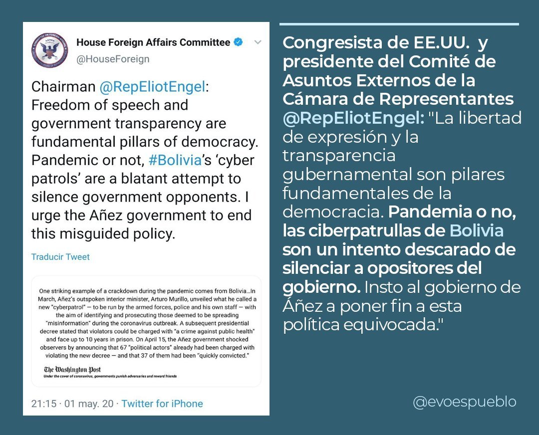 Los «ciberpatrullajes» condenados por el congresista de EE.UU. @RepEliotEngel evidencian la naturaleza del gobierno de facto en #Bolivia y de un Estado sin derecho, sin libertad de expresión y con graves violaciones a los DD.HH. Por si fuera poco, con intentos de prorroguismo. https://t.co/DVlxW2Cv68