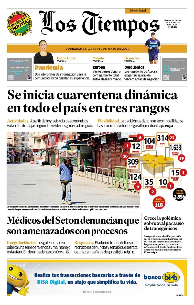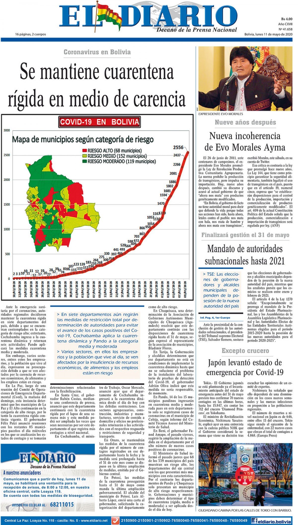 Portadas de periódicos de Bolivia del lunes 11 de mayo de 2020Categorías MonitoreoEtiquetas , Portadas de periódicos 11/05/2020 eju.tv Los Tiempos – El Día – La Razón – Cambio – El Diario – El Diario – Opinión => Recibir por Whatsapp las noticias destacadas