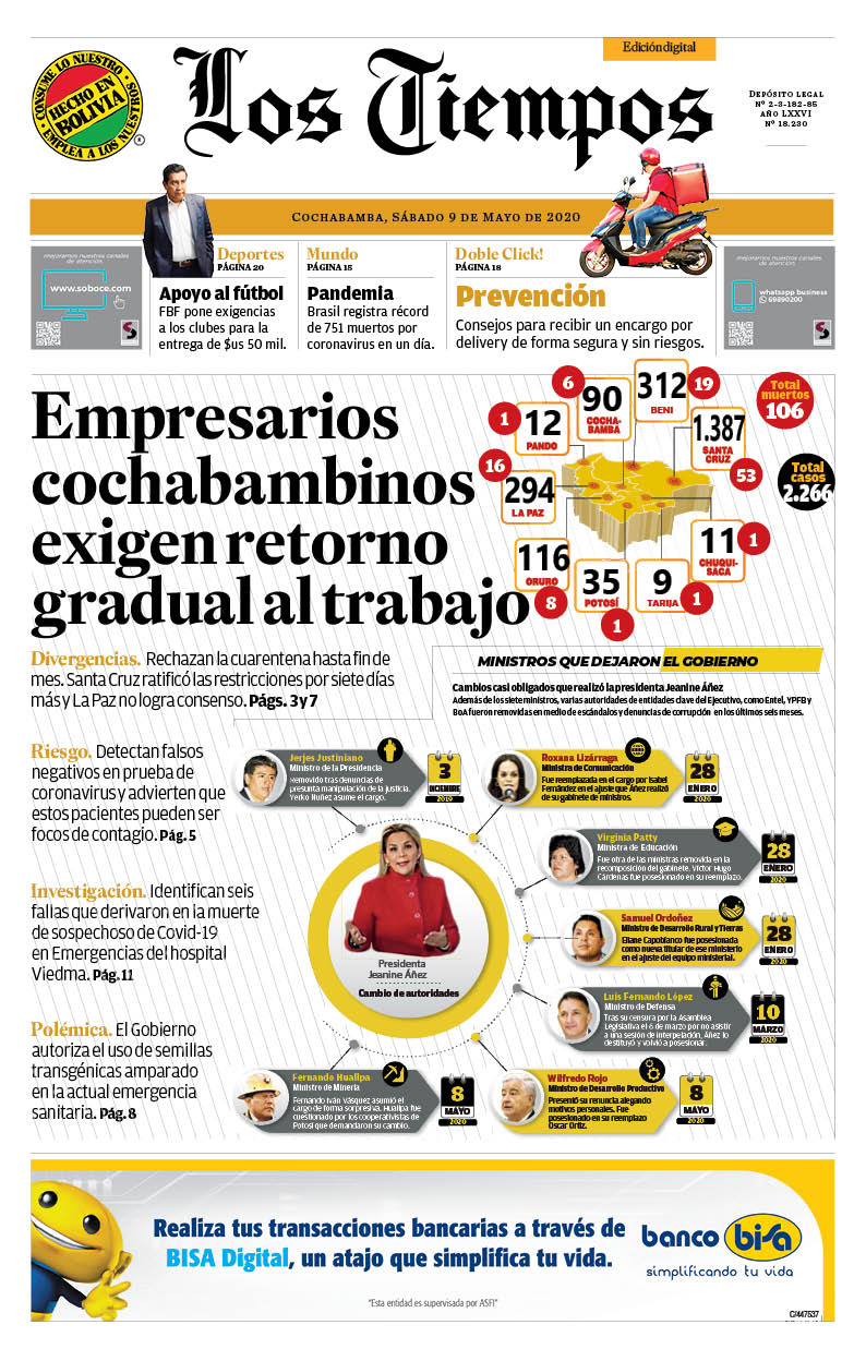 Portadas de periódicos de Bolivia del sábado 9 de mayo de 2020