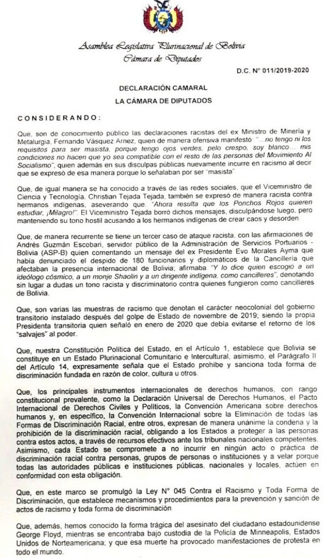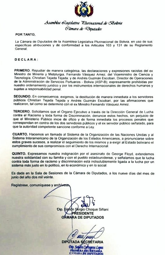 Saludo la Declaración aprobada por la Cámara de Diputados de #Bolivia que se solidariza con el pueblo estadounidense y la familia de #GeorgeFloyd, y, asimismo, exige destitución y procesamiento de funcionarios bolivianos que expresaron manifestaciones racistas y discriminatorias. https://t.co/Khb2urJCBK