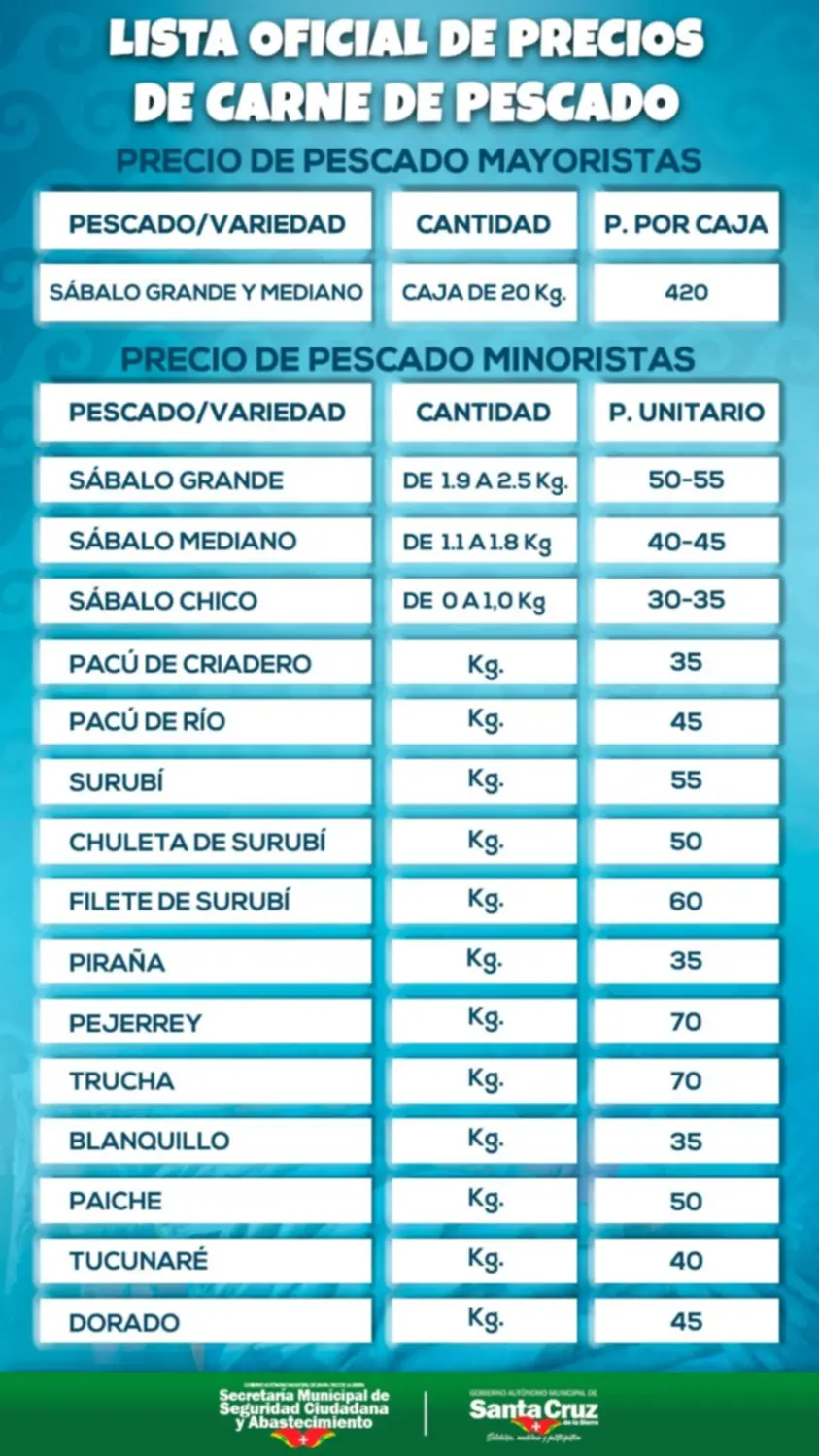 Este lunes, 25 de marzo, la Secretaría presentó la lista oficial de precios de una variedad de pescados que incluyen sábalo, pacú, entre otros.