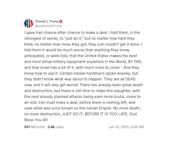 Las declaraciones del presidente estadounidense se difundieron a través de su red social Truth Social, en un contexto de máxima tensión tras la ofensiva israelí que, según reportes, eliminó a altos mandos de la Guardia Revolucionaria de Irán.