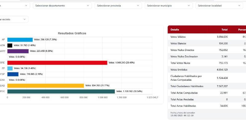 Tarija, Pando y Oruro son los primeros tres departamentos en cerrar el conteo. Por su lado, Chuquisaca bordea el 98% y se perfila como la cuarta región en concluir el proceso.