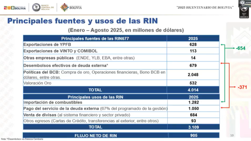 “En todo lo que es deuda externa, vean ustedes eses descalce que hay entre desembolsos efectivos de deuda externa con el pago de servicios de deuda, son 371 millones de dólares en lo que va la gestión que se ha tenido que también cubrir para que el país mantenga toda la condición de acreedor que tiene”, indicó el presidente del BCB.