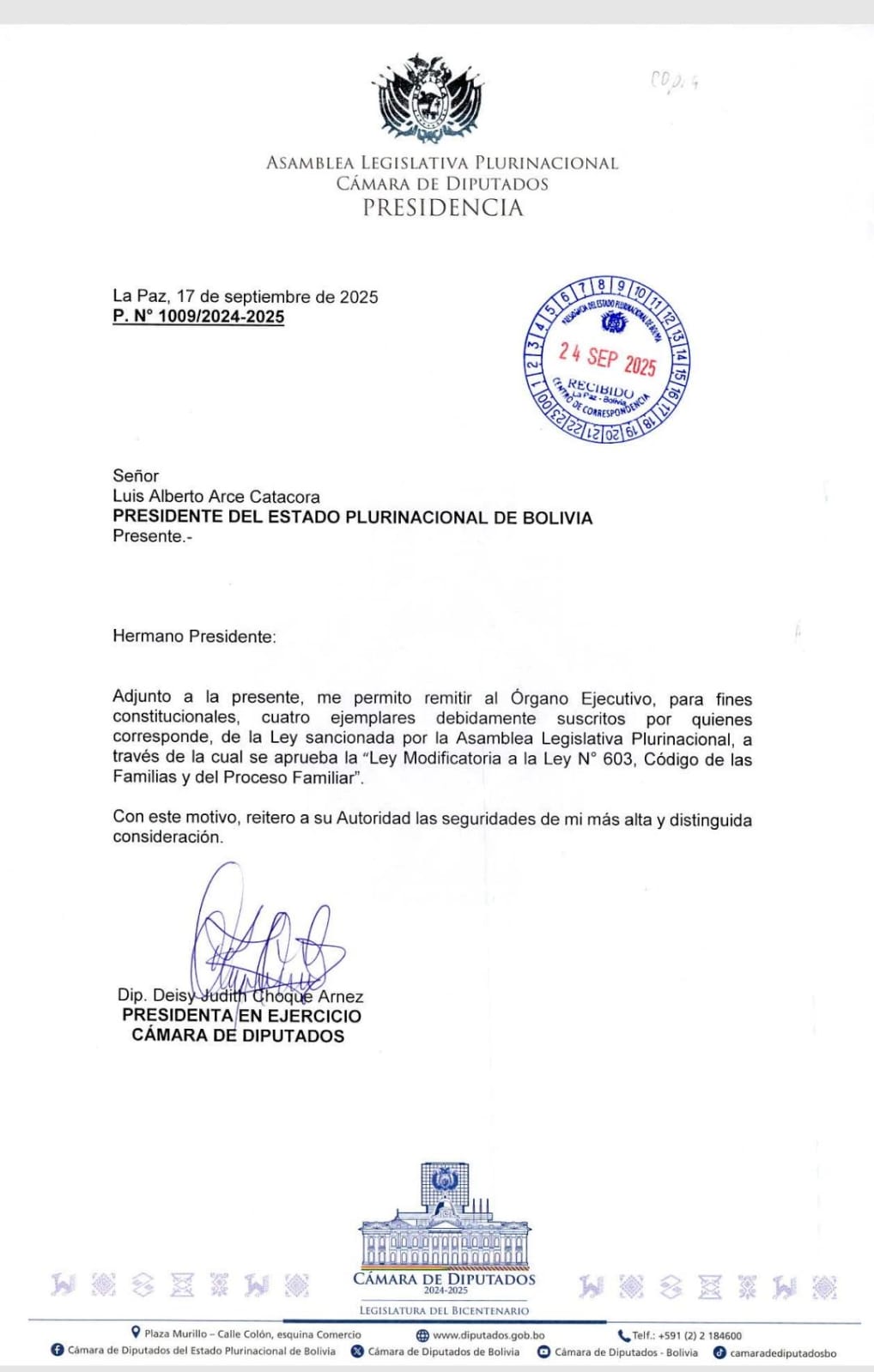 “Comunicamos al pueblo boliviano que ante declaraciones erradas que señalan un atraso en la promulgación de la ley que prohíbe el matrimonio infantil, aclaramos que la norma mencionada recién fue remitida al Órgano Ejecutivo hoy 24 de septiembre”, precisó el Ministerio de la Presidencia en una publicación en sus redes sociales.