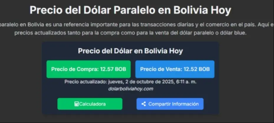 Según datos emitidos este jueves 2 de octubre de 2025, por el portal especializado dolarboliviahoy.com, la divisa estadounidense se cotiza en el mercado paralelo con un precio a la venta de 12.52 (BOB), y un precio de compra de 12.57 (BOB).