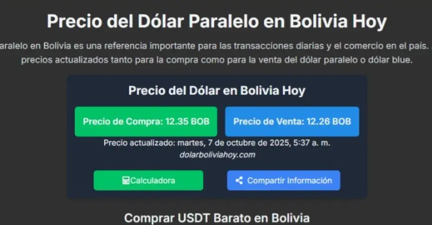 Según datos emitidos este martes 7 de octubre de 2025, por el portal especializado dolarboliviahoy.com, la divisa estadounidense se cotiza en el mercado paralelo con un precio a la venta de 12.26 (BOB), y un precio de compra de 12.35 (BOB).