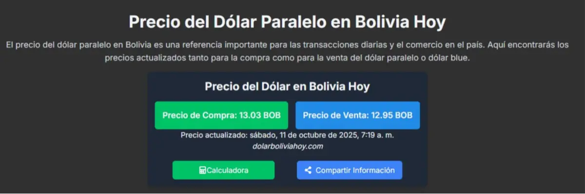 Según datos emitidos este sábado 11 de octubre de 2025 por el portal especializado dolarboliviahoy.com, la divisa estadounidense se cotiza en el mercado paralelo con un precio a la venta de 12.95 (BOB) y a un precio de compra de 13.03 (BOB).