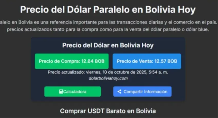 Según datos emitidos este viernes 10 de octubre de 2025, por el portal especializado dolarboliviahoy.com, la divisa estadounidense se cotiza en el mercado paralelo con un precio a la venta de 12.57 (BOB), y un precio de compra de 12.64 (BOB).
