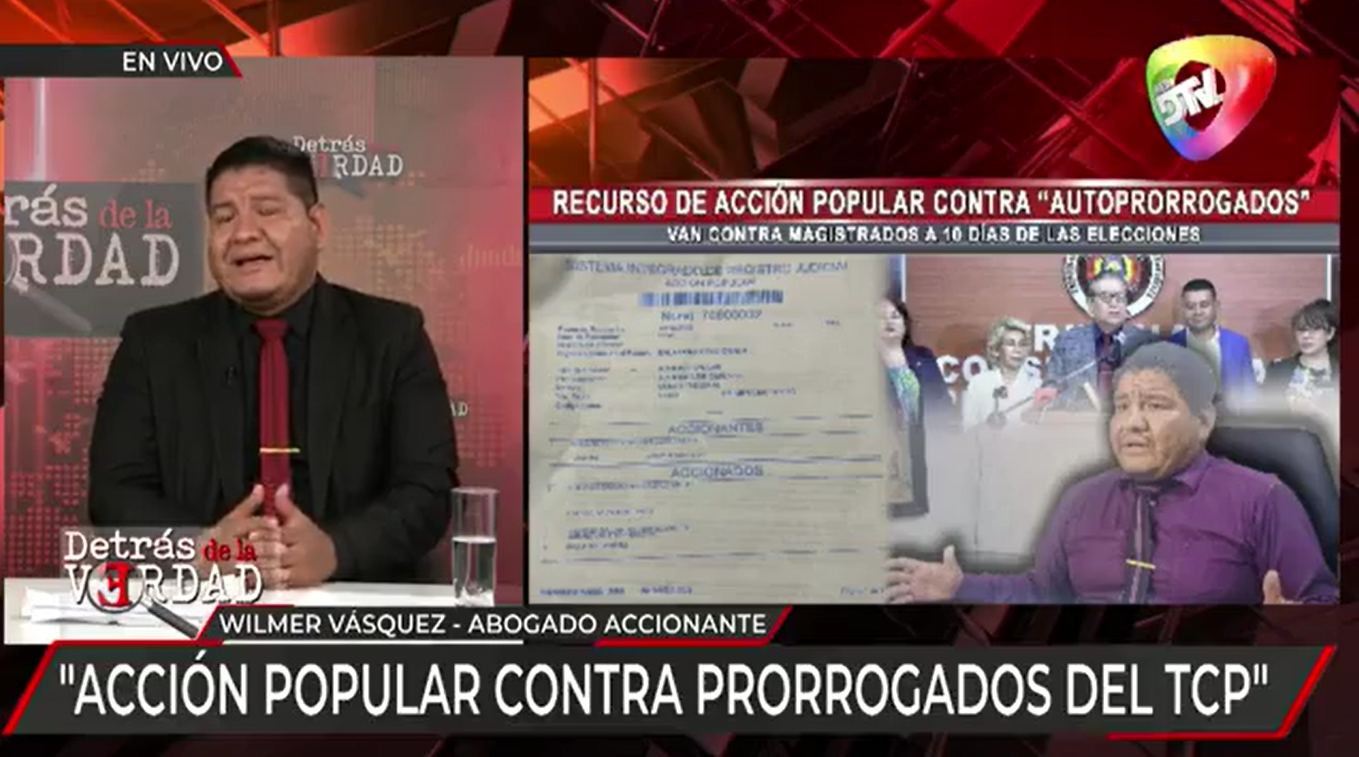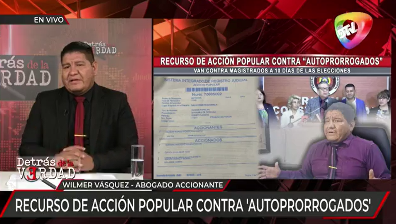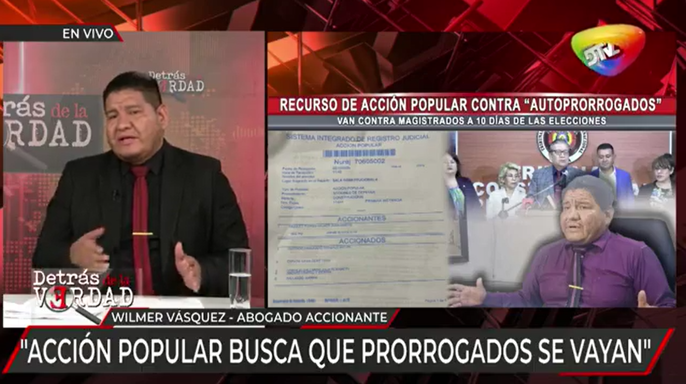 El abogado constitucionalista Wilmer Vásquez presentó en las pasadas horas una acción popular ante la Sala Constitucional Cuarta de Santa Cruz contra los magistrados autoprorrogados del Tribunal Constitucional Plurinacional (TCP), a quienes acusa de violar la Constitución y usurpar funciones al extenderse ilegalmente en sus cargos; asimismo, exige la nulidad de todos los fallos emitidos por esas autoridades y el cese inmediato de sus funciones, por considerarlos contrarios a los derechos colectivos y a la seguridad jurídica del país.